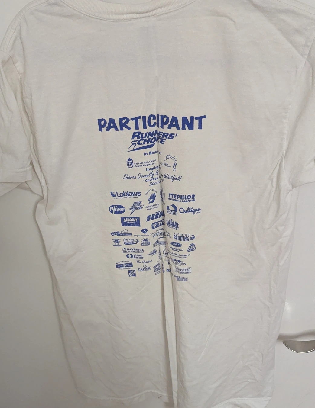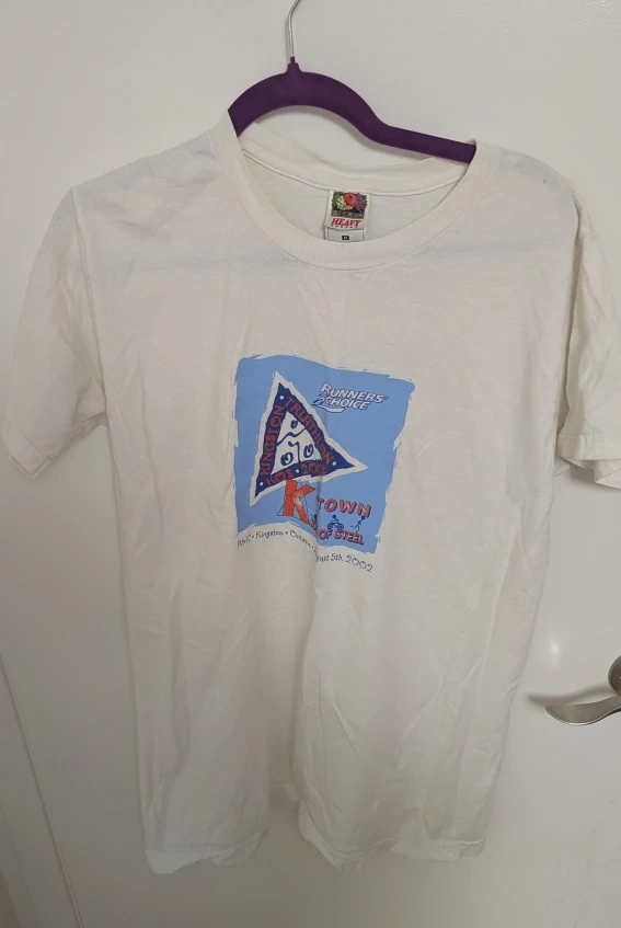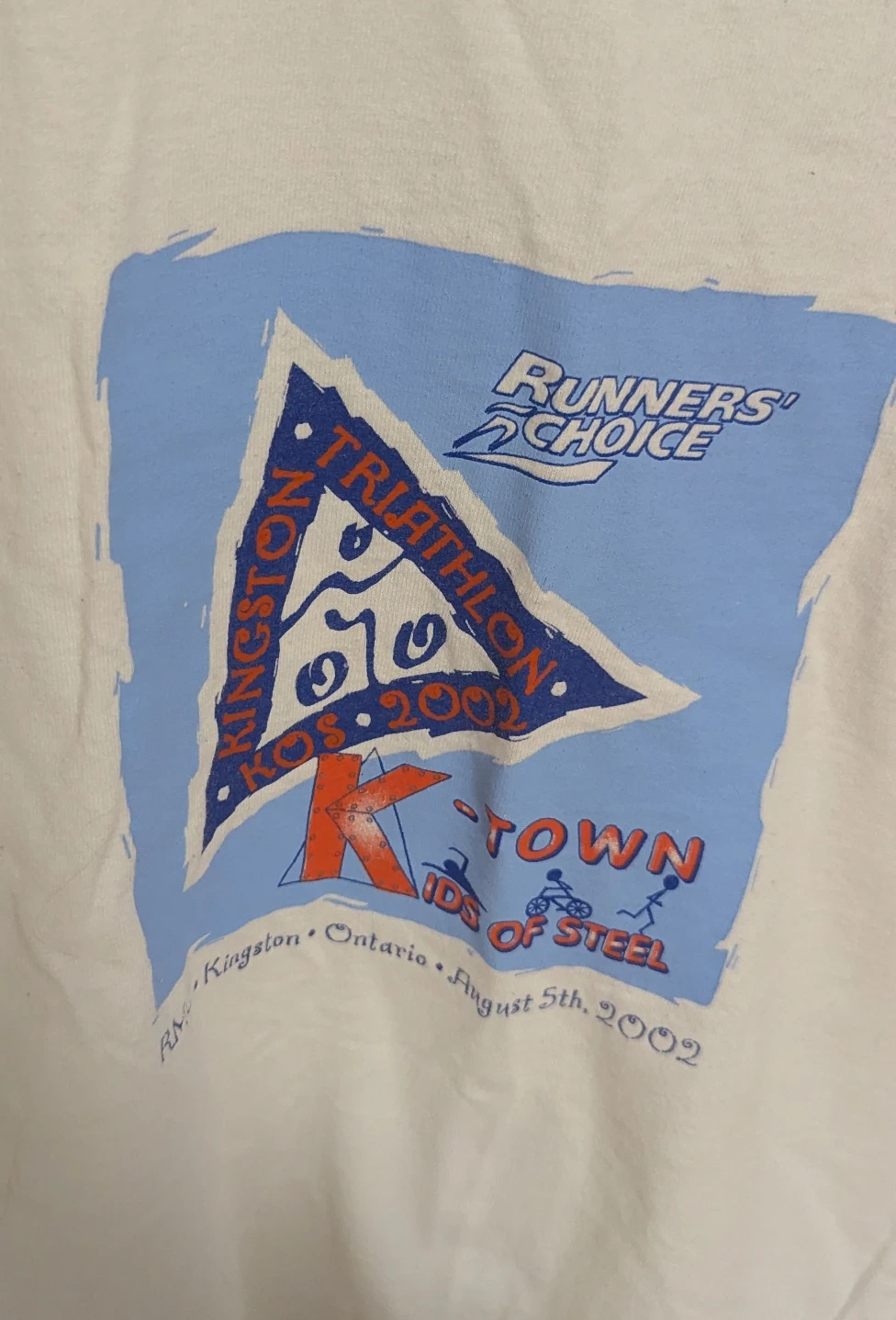 Selling a Fruit of the Loom t-shirt from the Runners' Choice Kingston Triathlon. It's a size medium and made of heavy cotton. Great for casual wear or as a souvenir!