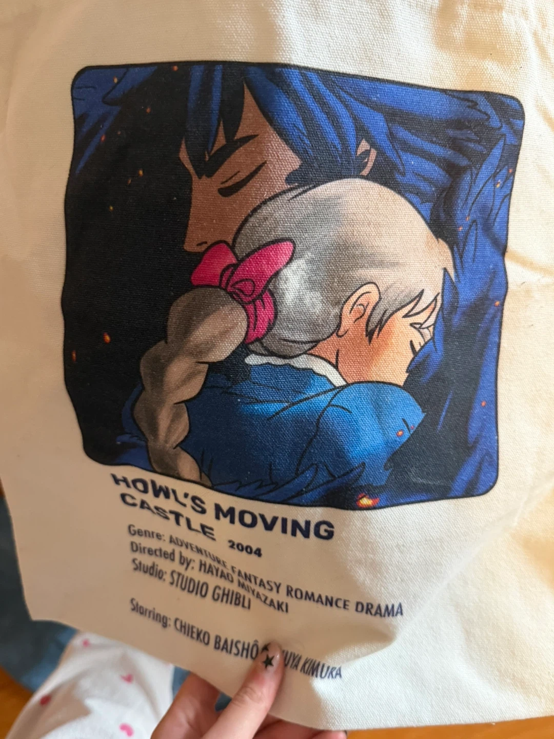 Here's a cute tote bag featuring a scene from Howl's Moving Castle! It's perfect for carrying books, groceries, or anything else you need on the go. The bag features a print of Howl and Sophie hugging, and is a great way to show off your love for Studio Ghibli
