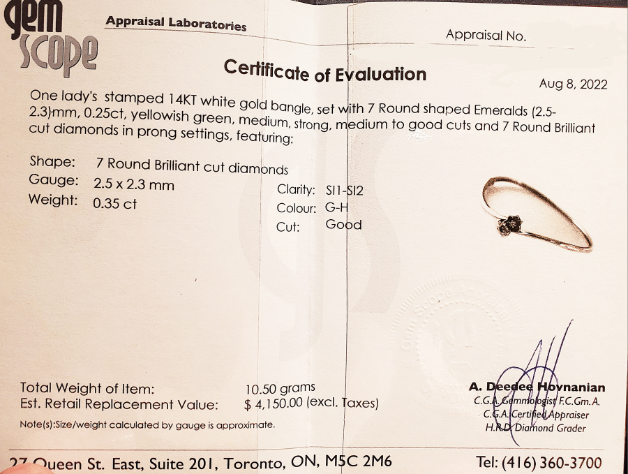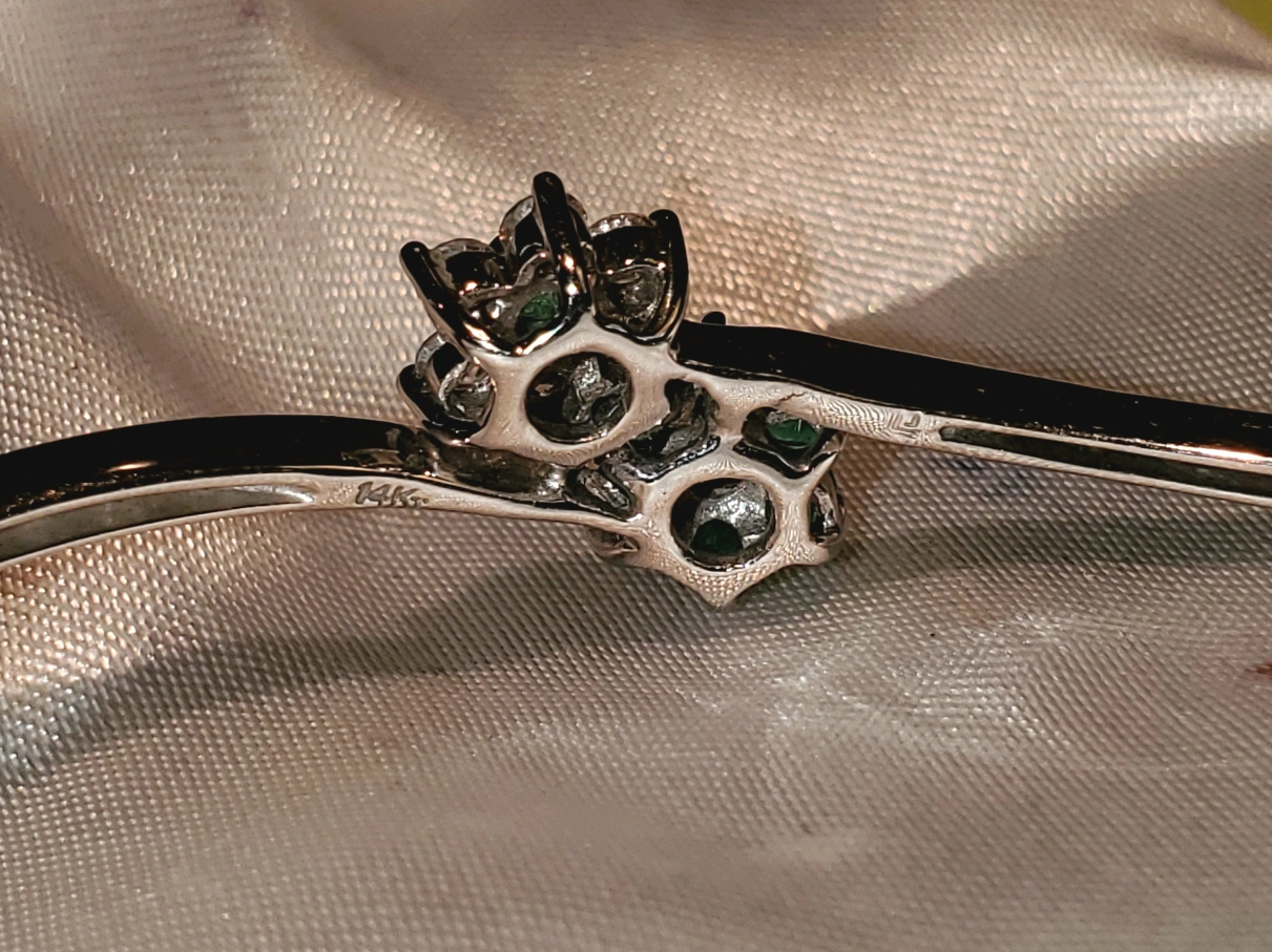 Selling a beautiful 14K white gold bangle bracelet. It features a lovely floral design with emerald and diamond accents. It's in great condition and would make a wonderful addition to any jewelry collection! I had the bracelet appraised a few yes ago at $4150. The price indicated is fixed