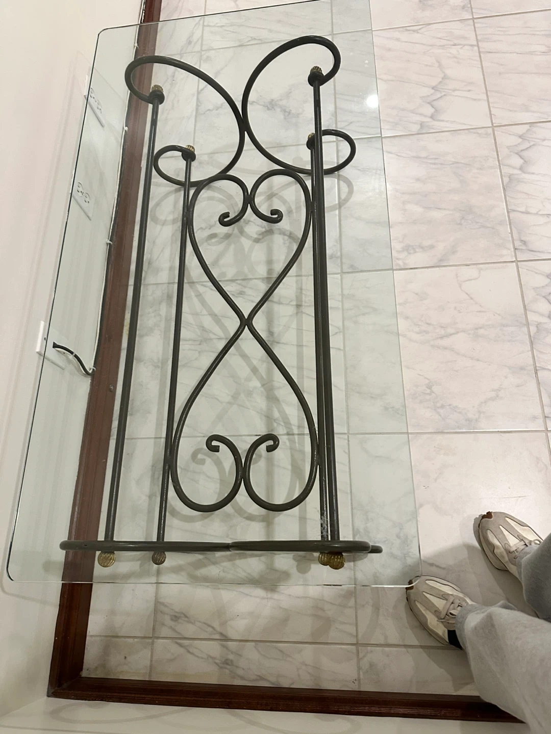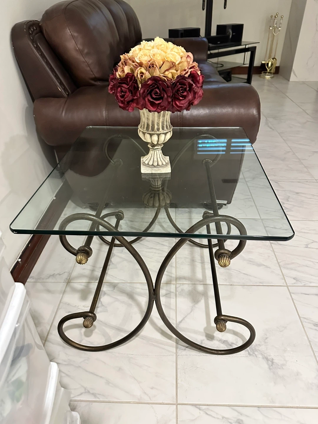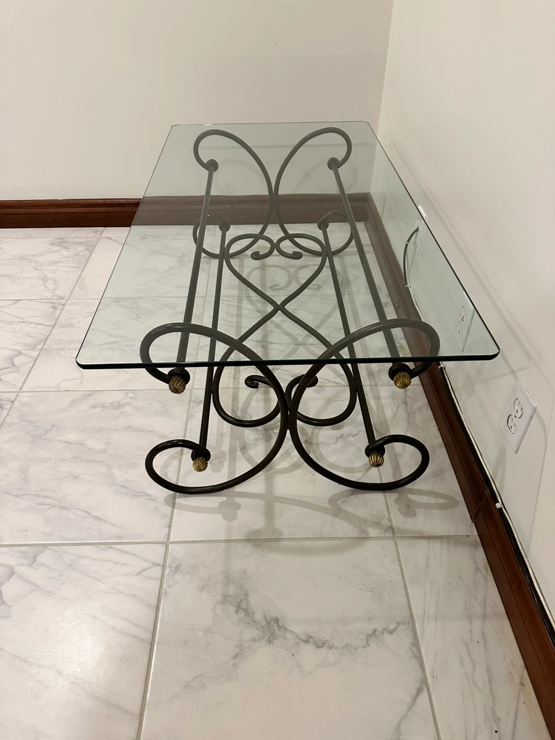 Selling a coffee table with a glass top and a decorative metal base. It's in good condition and would look great in any living room!