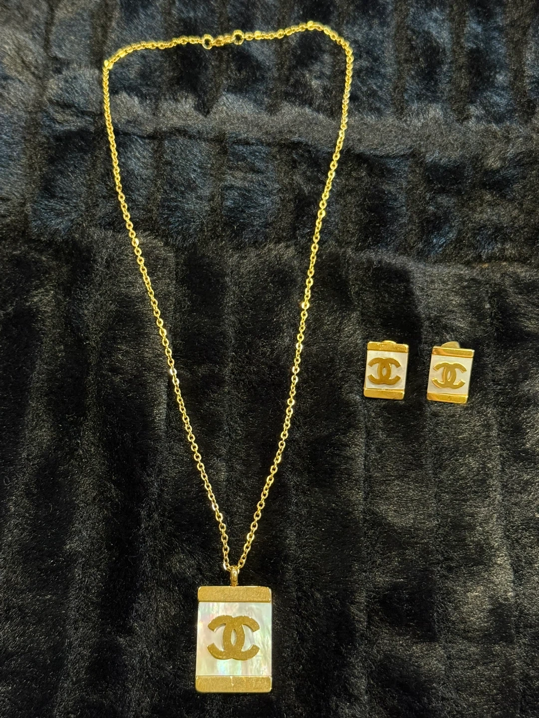 Selling a beautiful necklace and earrings set! The hardware is gold-toned, and the inserts appear to be mother-of-pearl. A classic and elegant addition to any jewelry collection