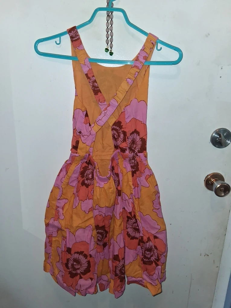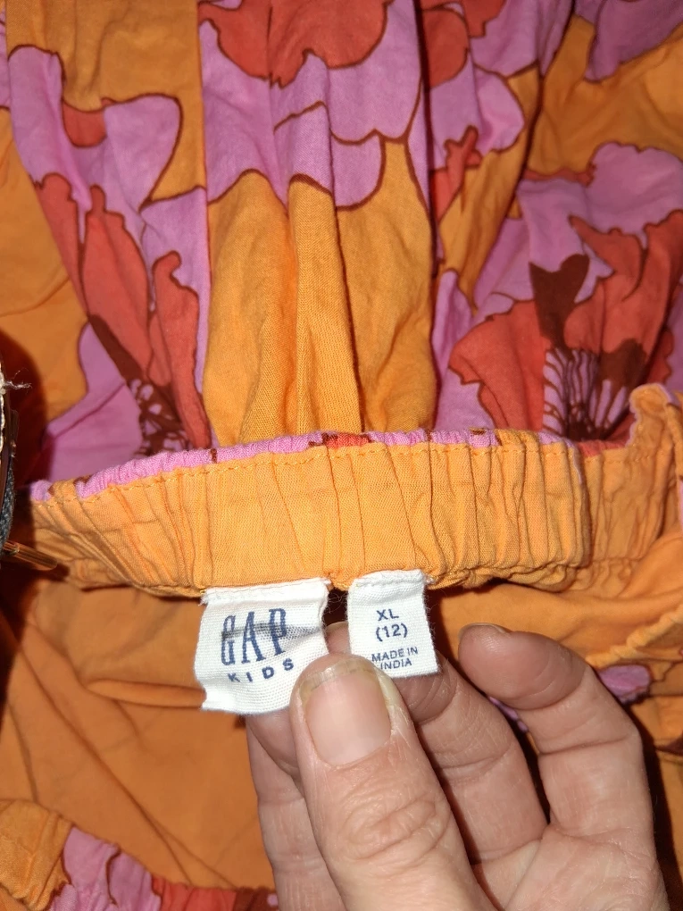 This is a cute Gap Kids dress with a bright floral pattern in shades of orange and pink. It's a size XL (12) and made in India. Perfect for a sunny day!