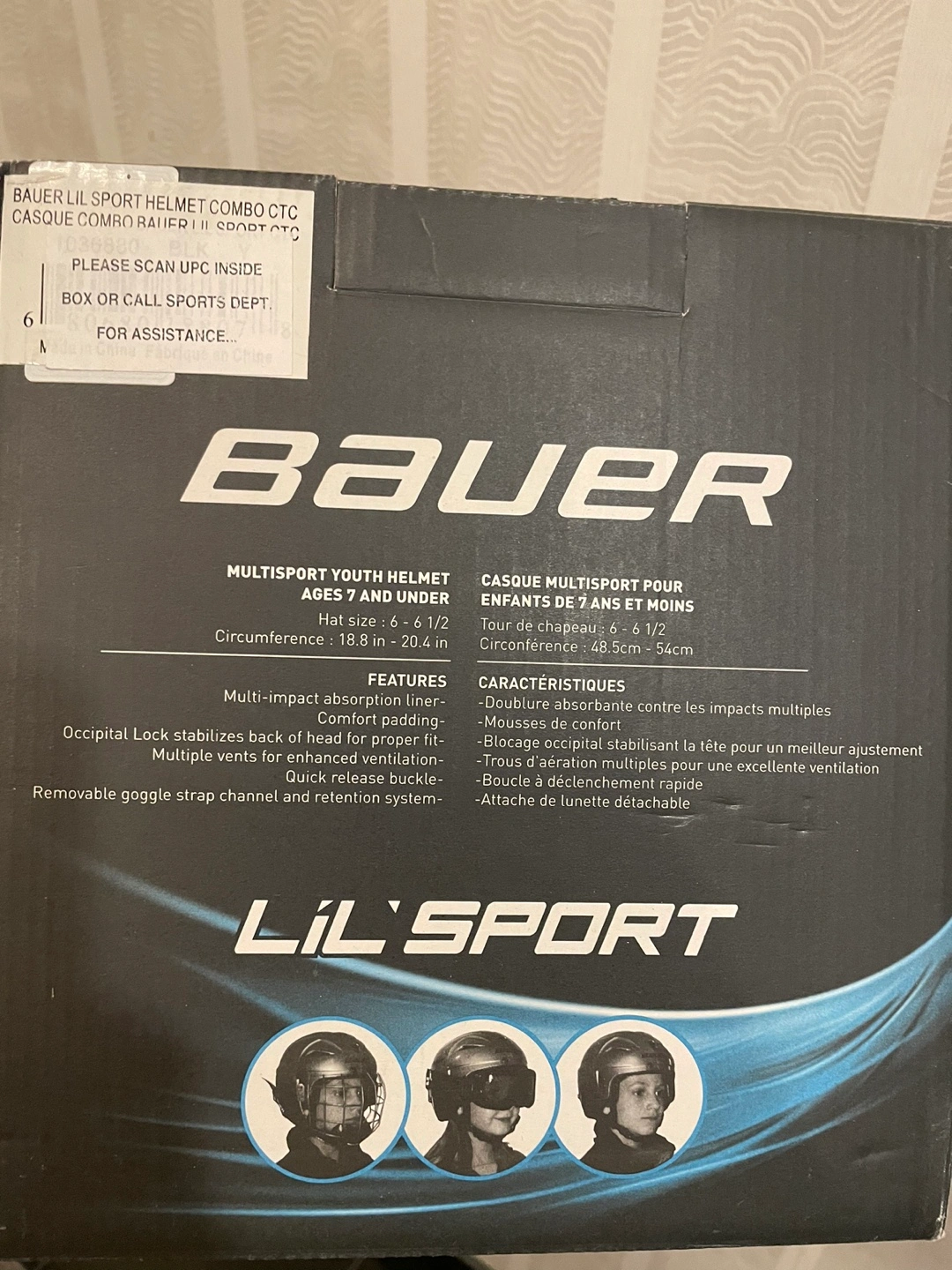 Selling a Bauer Lil' Sport youth hockey helmet combo! It's a multisport helmet designed for ages 7 and under.