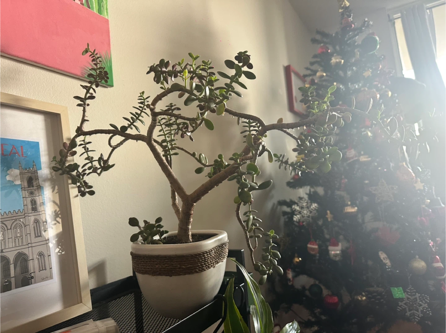 A lovely jade bonsai tree ready to bring some zen to your space! It comes in a stylish white pot with a woven accent. It's a healthy and established plant, perfect for adding a touch of nature to your home or office.