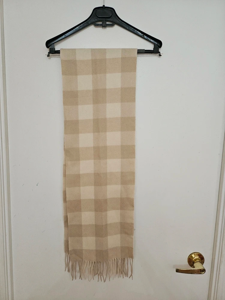 Cozy Uniqlo scarf made from 100% cashmere. The scarf features a stylish beige checkered pattern. Perfect for keeping warm on chilly days!