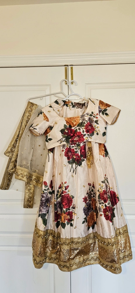 A beautiful floral Lengha Choli set! It's in great condition and features a lovely floral pattern with gold detailing. Perfect for special occasions or cultural events