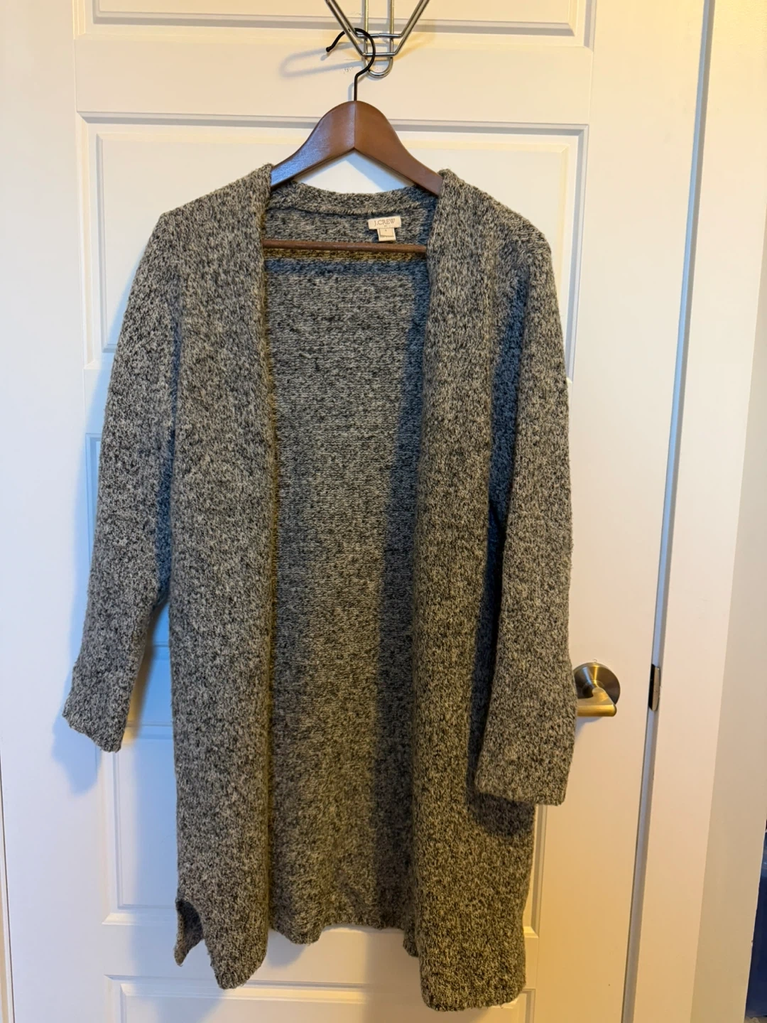 Selling a cozy J.Crew open-front cardigan in a lovely grey colour. It's in great condition and perfect for layering on those cooler days. A stylish and comfortable addition to any wardrobe!