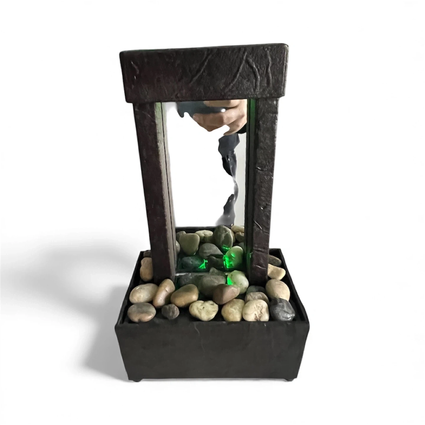 This is a lovely indoor water fountain, perfect for adding a calming atmosphere to any room. It features a dark frame, smooth rocks, and gentle water flow. The fountain also has subtle green, red, blue lighting to enhance the ambiance
