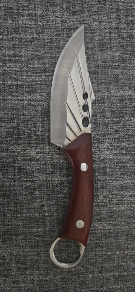 Selling a unique, custom-made karambit knife. It features a sharp, curved blade with a distinctive design and a comfortable wooden handle. The knife also has a ring at the end for a secure grip. Great for collectors or everyday carry