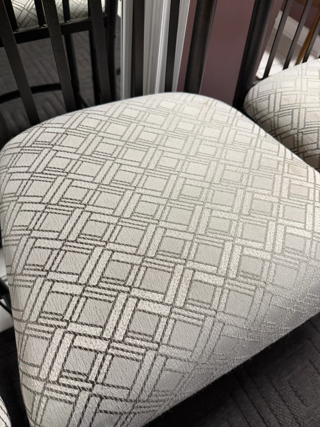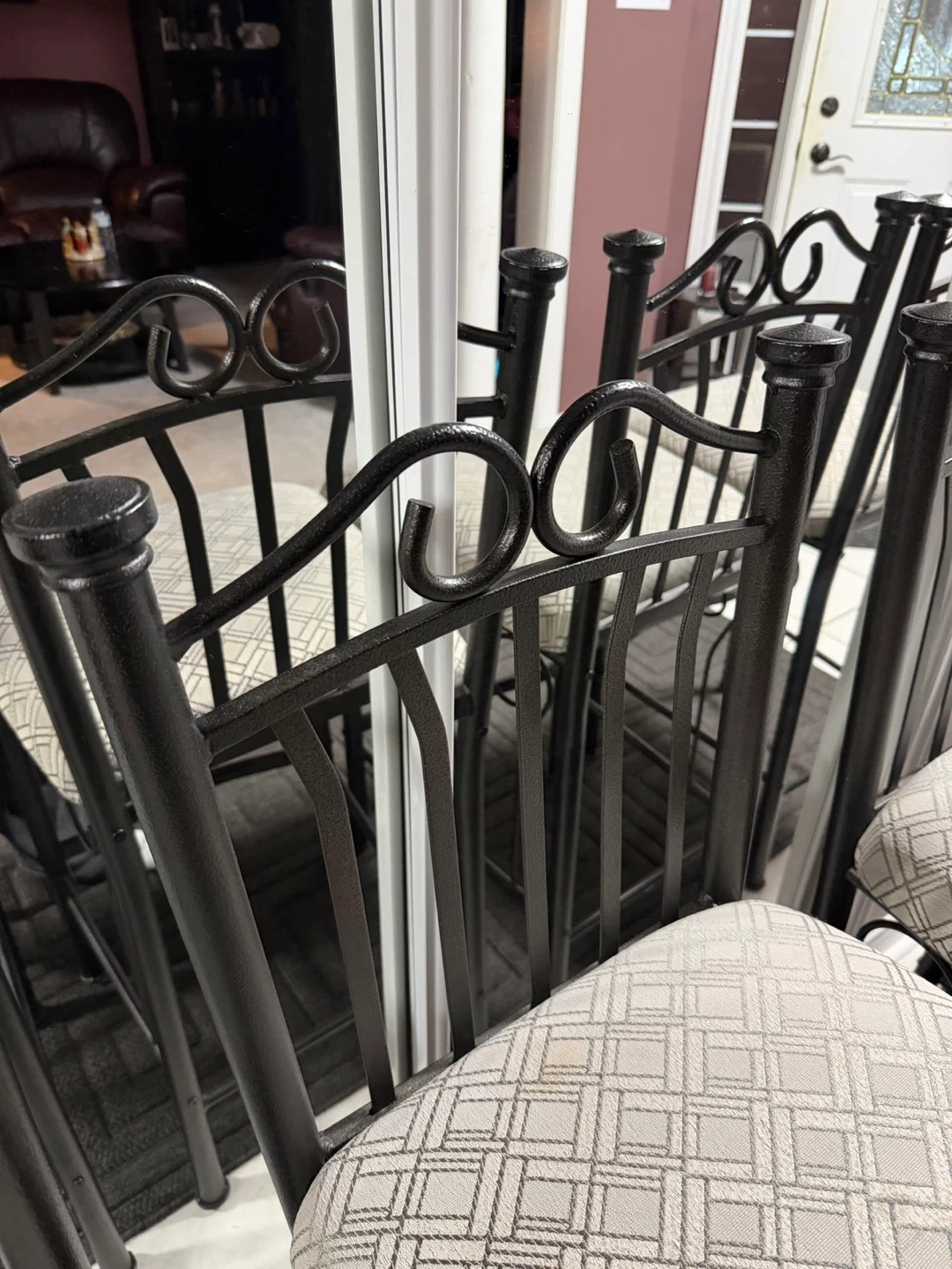 Selling a set of four bar stools with a black metal frame and patterned fabric seat.