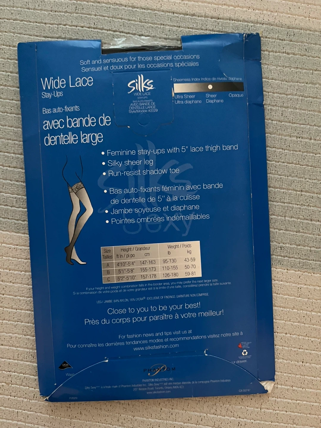 Selling a pair of Silks Sexy Wide Lace Stay-Ups in size A! These feminine stay-ups feature a 5" lace thigh band and a silky sheer leg. They also have a run-resistant shadow toe. They are soft and sensuous for those special occasions!