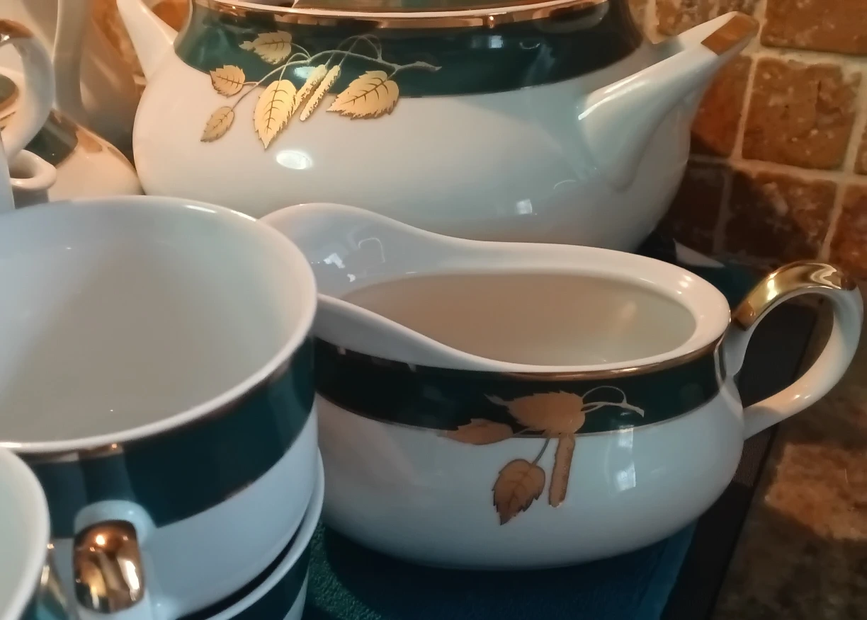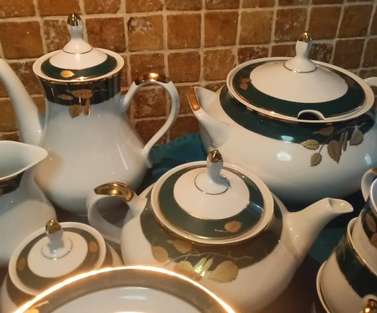 This Stunning Set is White with Very Pretty Green Trim and Gold Leaves Pattern.