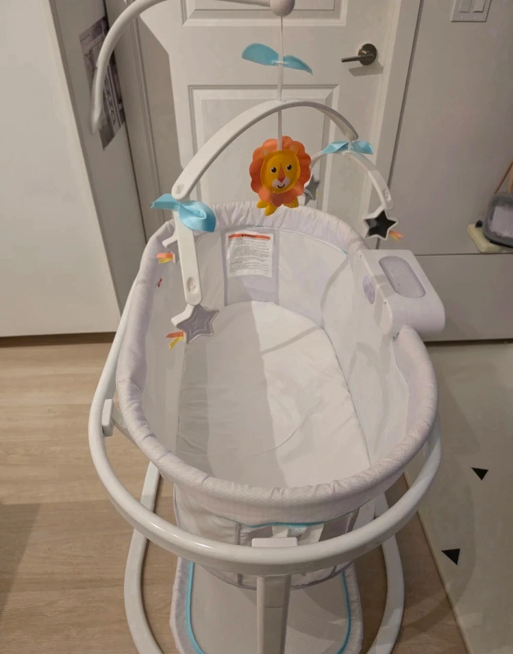 Selling a Fisher-Price Soothing Motions Bassinet! It's in great shape and ready for a new little one. The bassinet features gentle rocking motions, calming vibrations, and soothing sounds to help your baby drift off to sleep. It also has a cute mobile with toys to keep them entertained. Perfect for newborns!