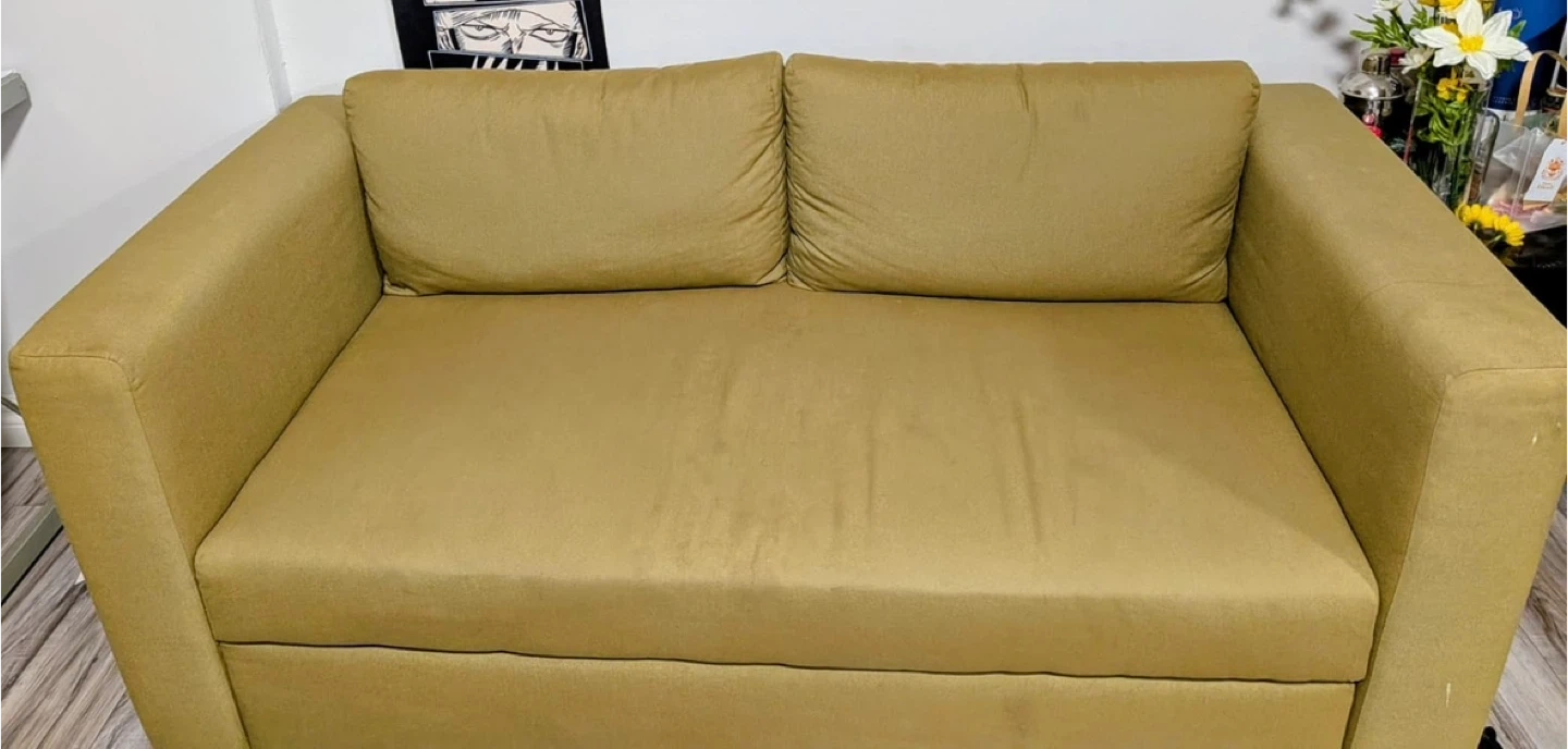 Selling a comfy olive green sofa bed. It's in great shape and perfect for small spaces or a guest room. It easily converts into a bed when needed with extra storage. Have very light stains but not visible .