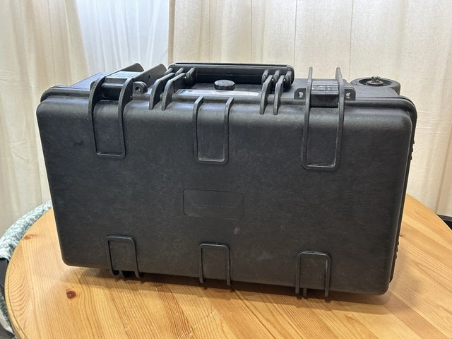 Amazon basics brand. Great for photography gear. Needs new foam insert. Good condition. Two wheels and retractable handle.