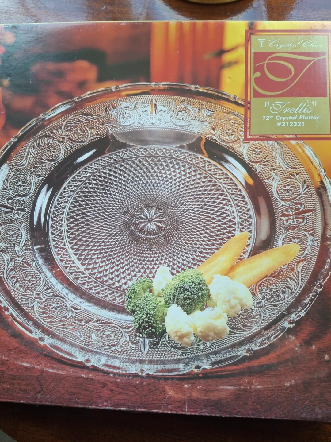 Crystal platter- Crystal Clear “Trellis.” 12 inches. Never used, still in box with label.