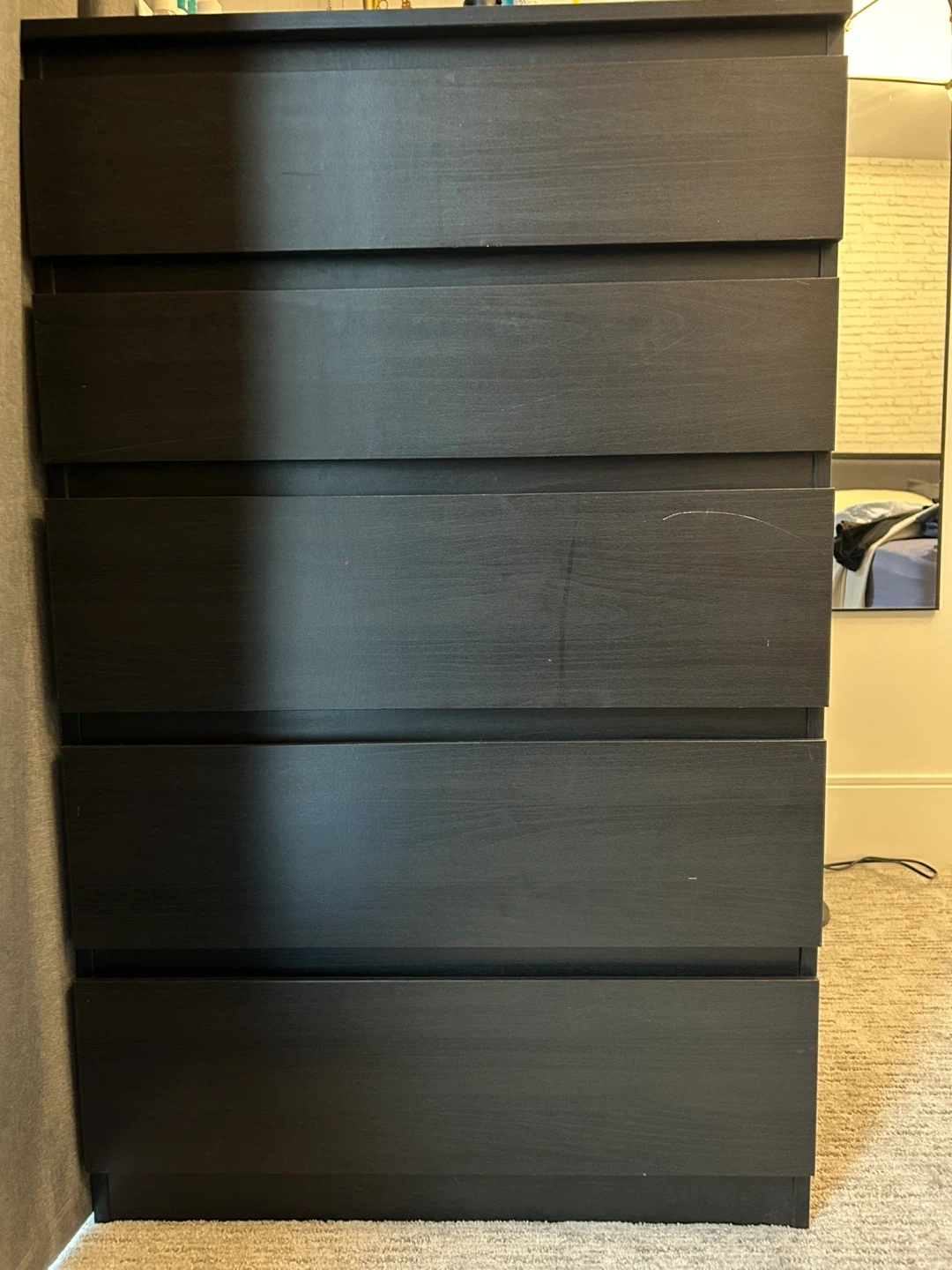Selling a used IKEA Malm dresser in black-brown. It has five drawers and is in good condition.