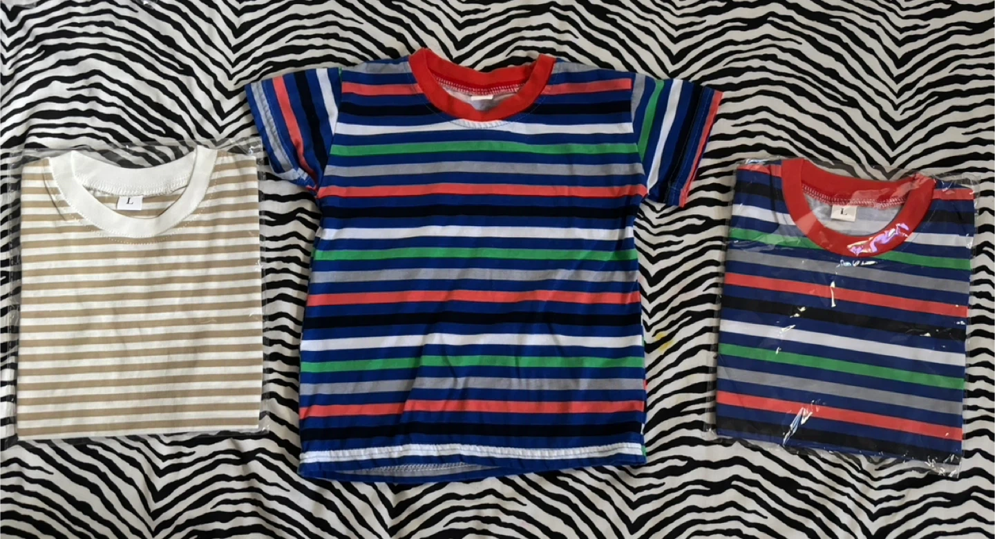 Selling a set of assorted striped T-shirts, They come in various colours and stripe patterns, perfect for casual wear. Each shirt is still in its original packaging between 2-4 years old fit to wear this T-shirt $10 for all or $3/each