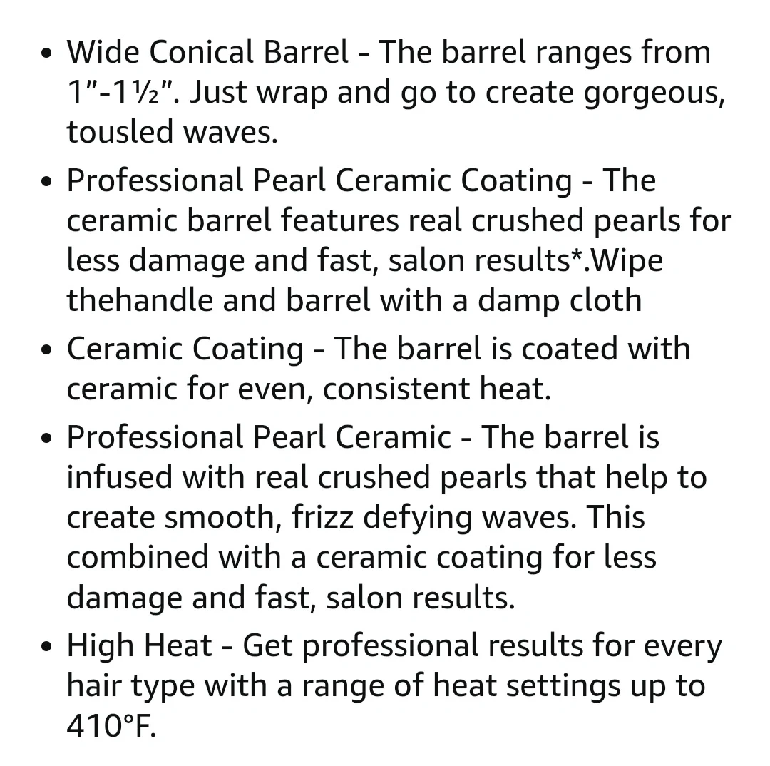 Get gorgeous, tousled waves with this Remington Pro curling wand! The barrel ranges from 1" to 1 1/2", and it features a professional pearl ceramic coating for less damage and fast, salon-quality results. It heats up to 410°F for professional results on any hair type