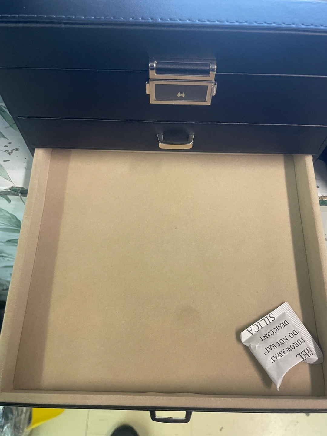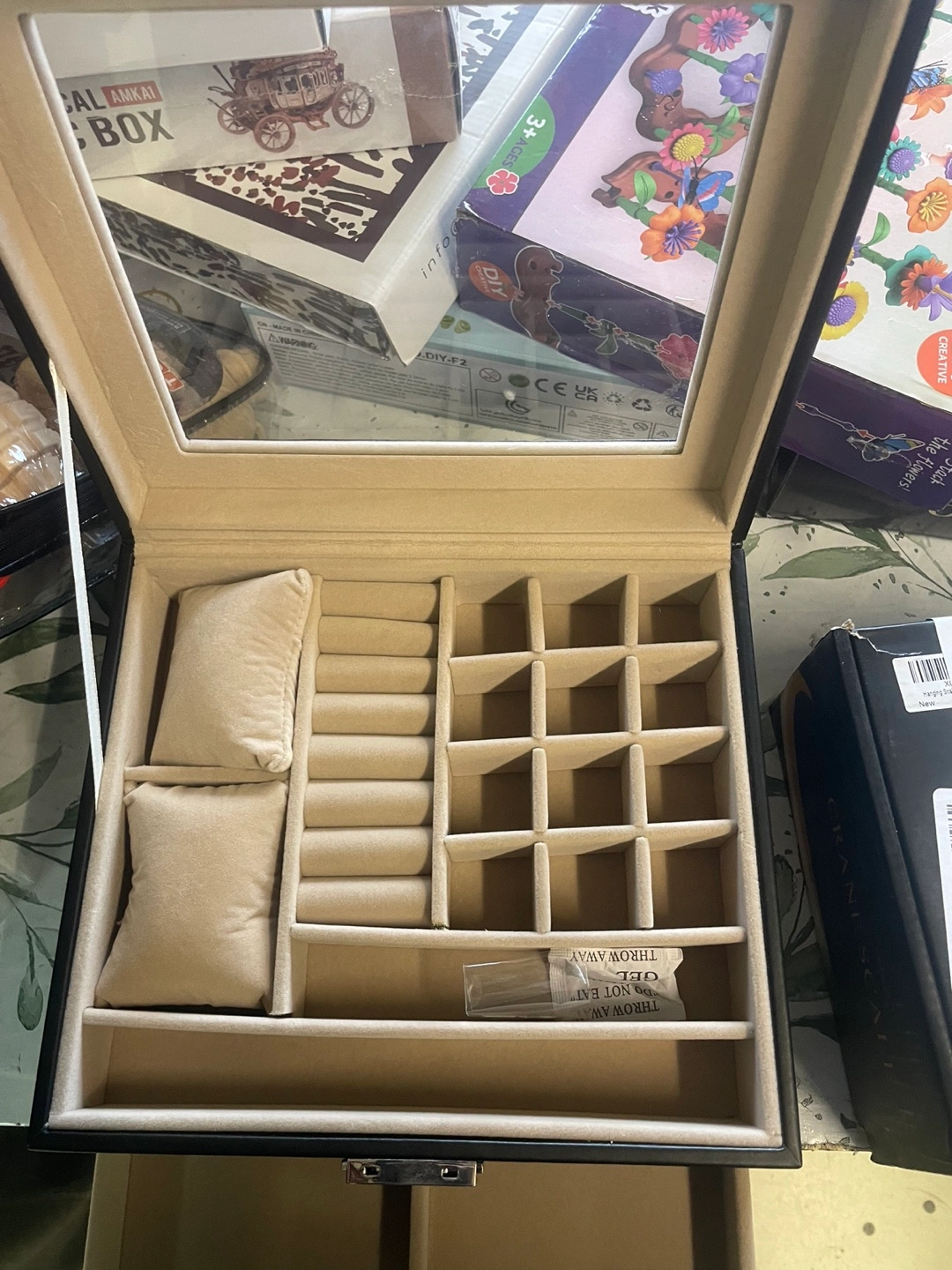Here's a black jewelry box with a clear top and three drawers! It's perfect for organizing your rings, necklaces, and other accessories. The inside is a soft beige colour.