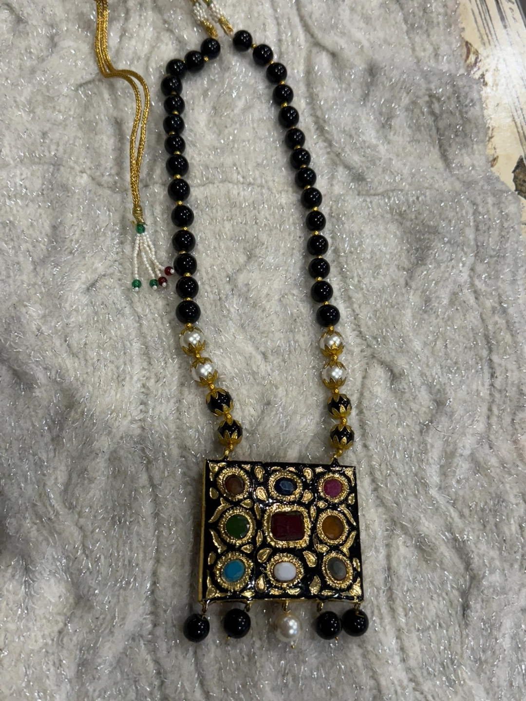 This is a beautiful beaded necklace featuring a square pendant adorned with various gemstones and pearl accents. On Back carved details. The necklace has a unique and eye-catching design.