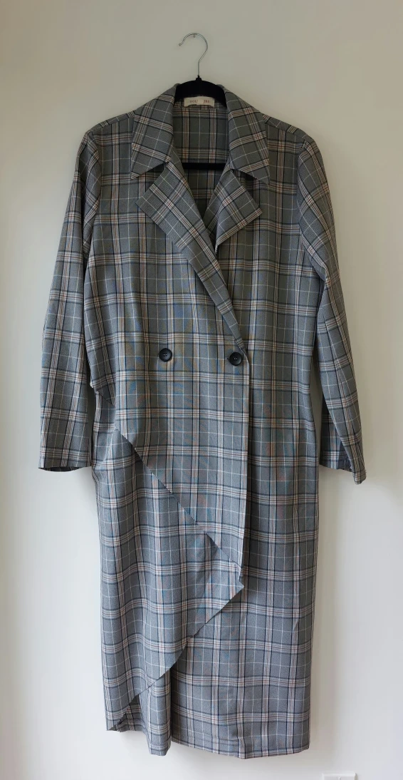 Here's a stylish plaid trench coat in a size large! The coat features a classic double-breasted design with a unique asymmetrical hem. It's perfect for adding a touch of sophistication to any outfit.