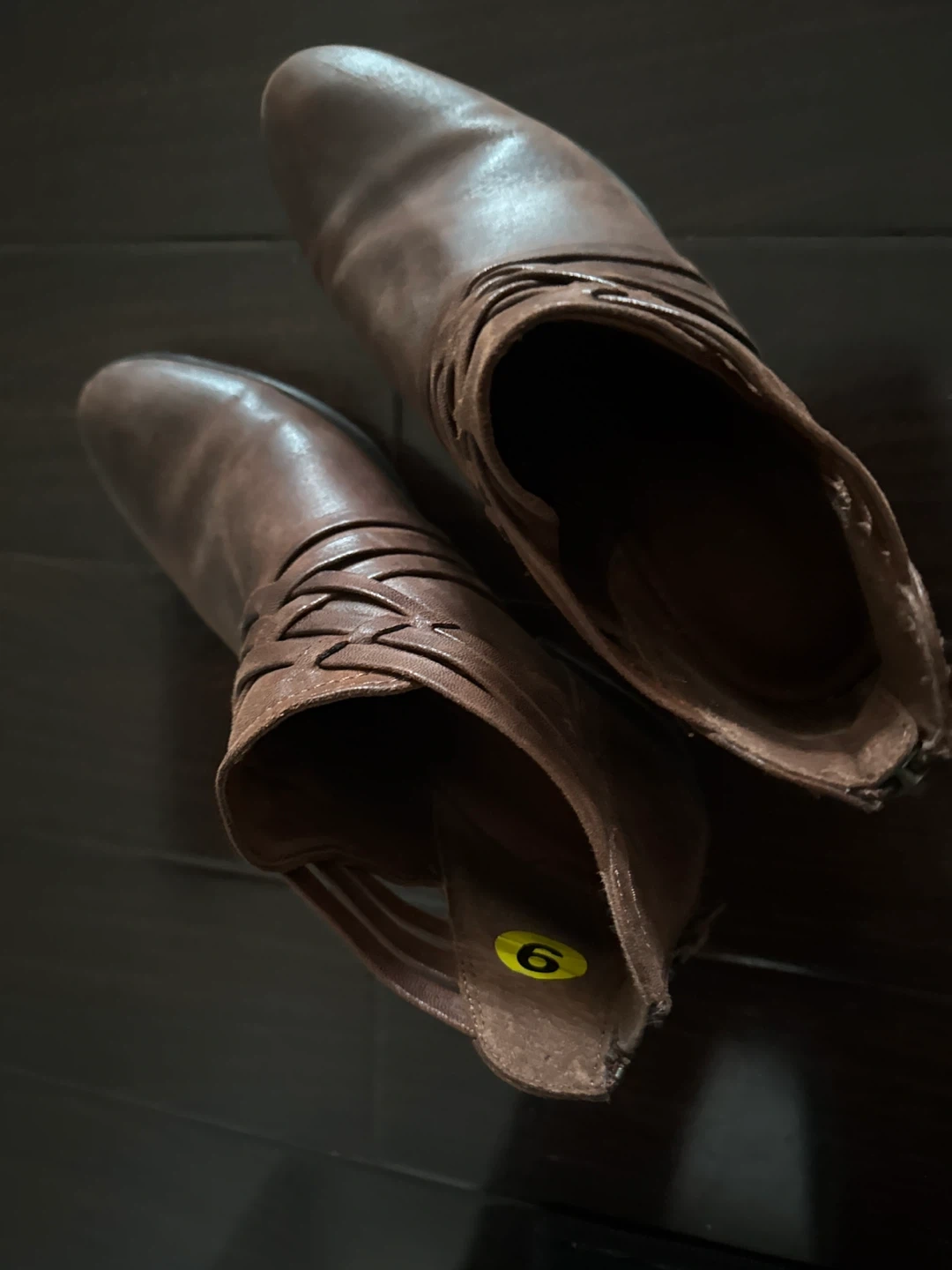 Selling a pair of brown ankle boots in women's size 6. They have a stylish woven design and a convenient zipper at the back. Perfect for adding a touch of flair to your outfit!