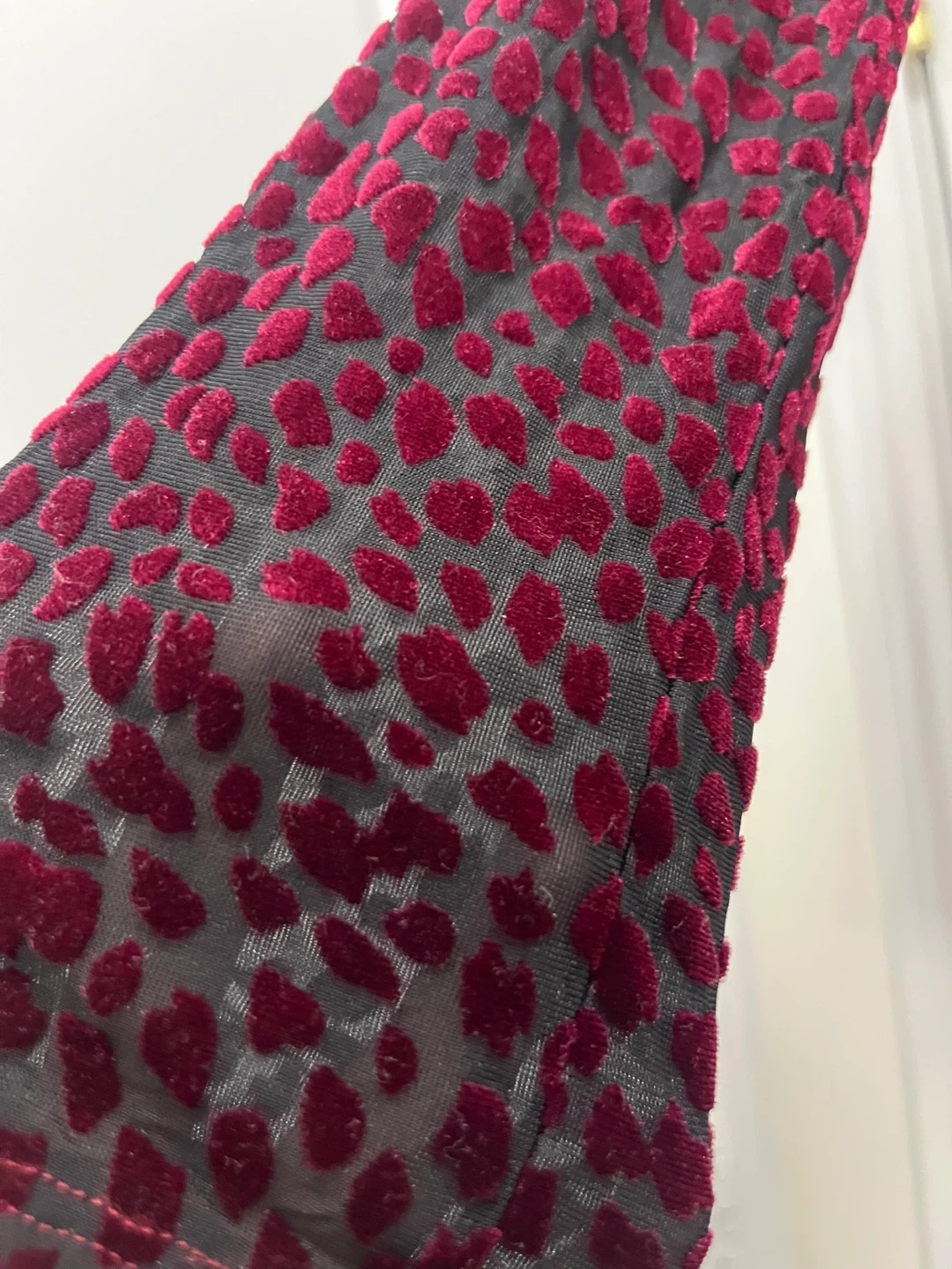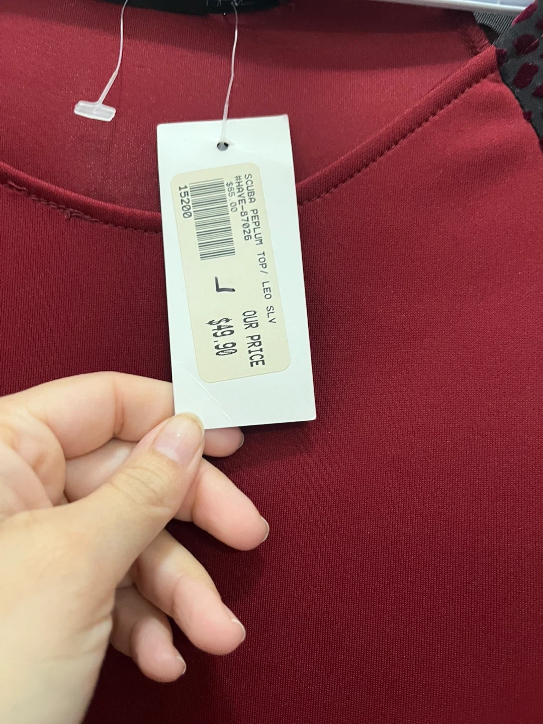 This is a Yaya & Co. red peplum top with long sleeves. The sleeves are a sheer red material with a velvet-like red pattern. It's a size large and originally retailed for $49.90