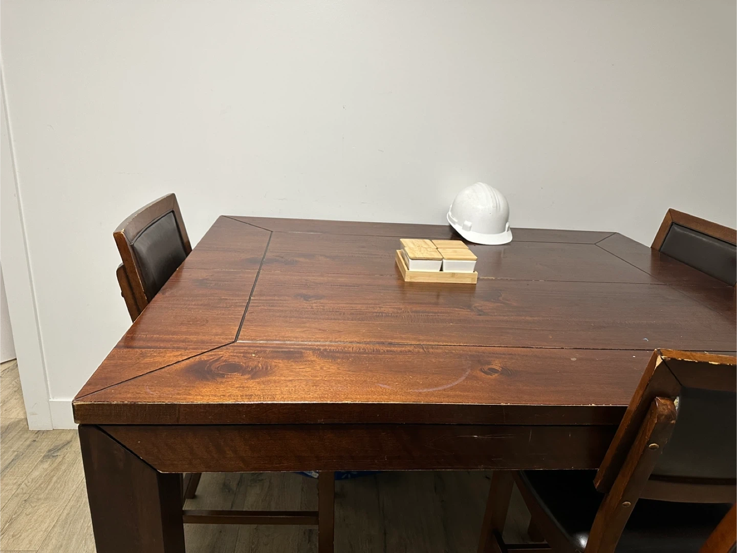 Selling a dark wood dining table with four matching chairs. The set is in good condition and would look great in any dining room or kitchen. The chairs have brown leather seats.