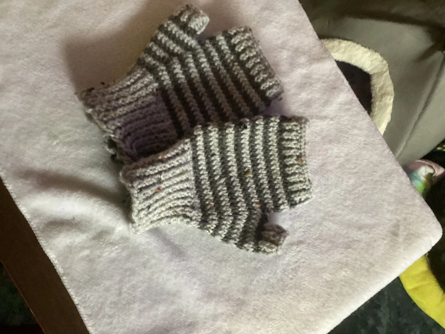 Here are some cozy, handmade boot cuffs! They're grey with dark grey stripes and would be perfect for adding a little extra warmth and style to your winter outfits
