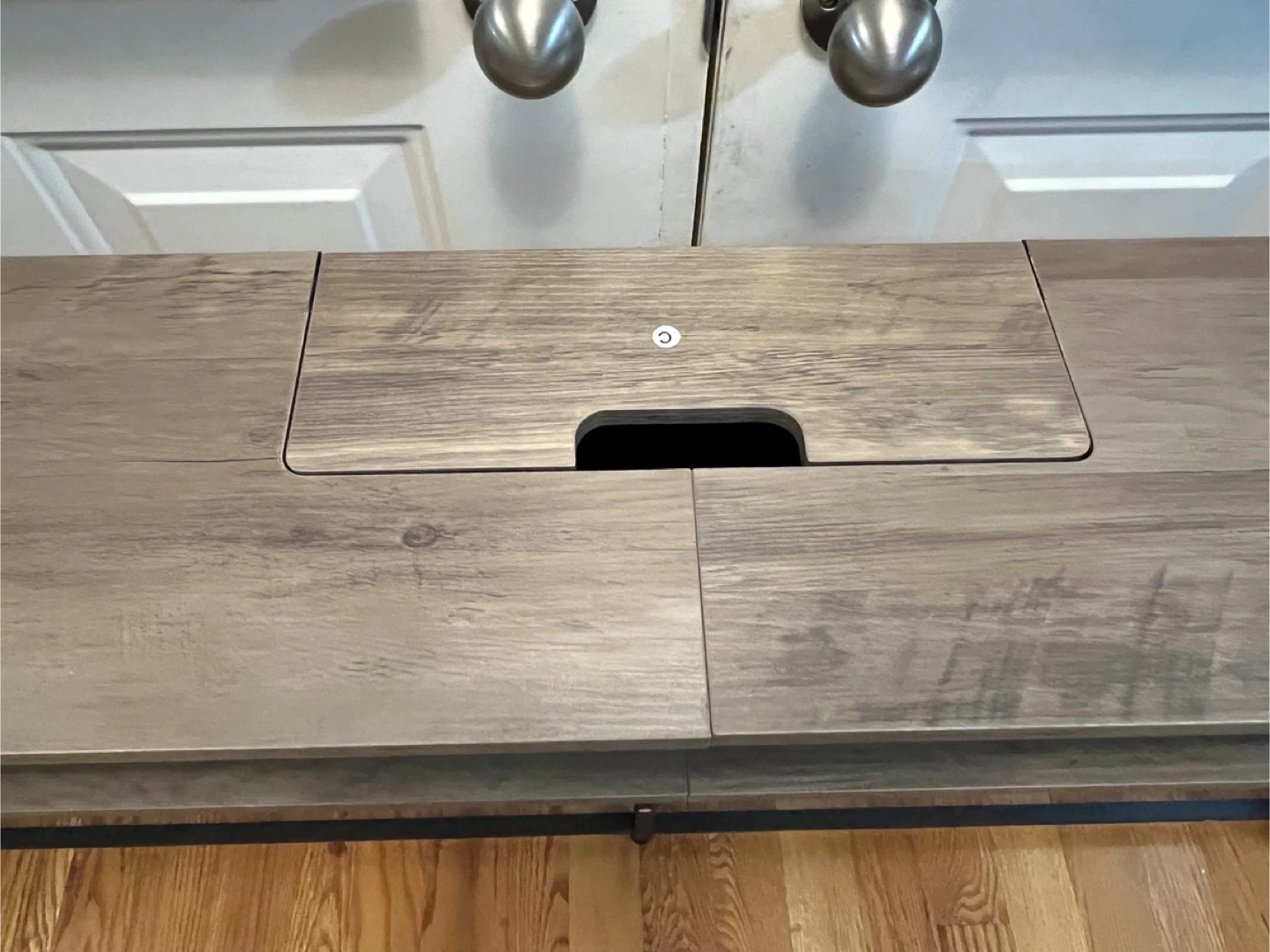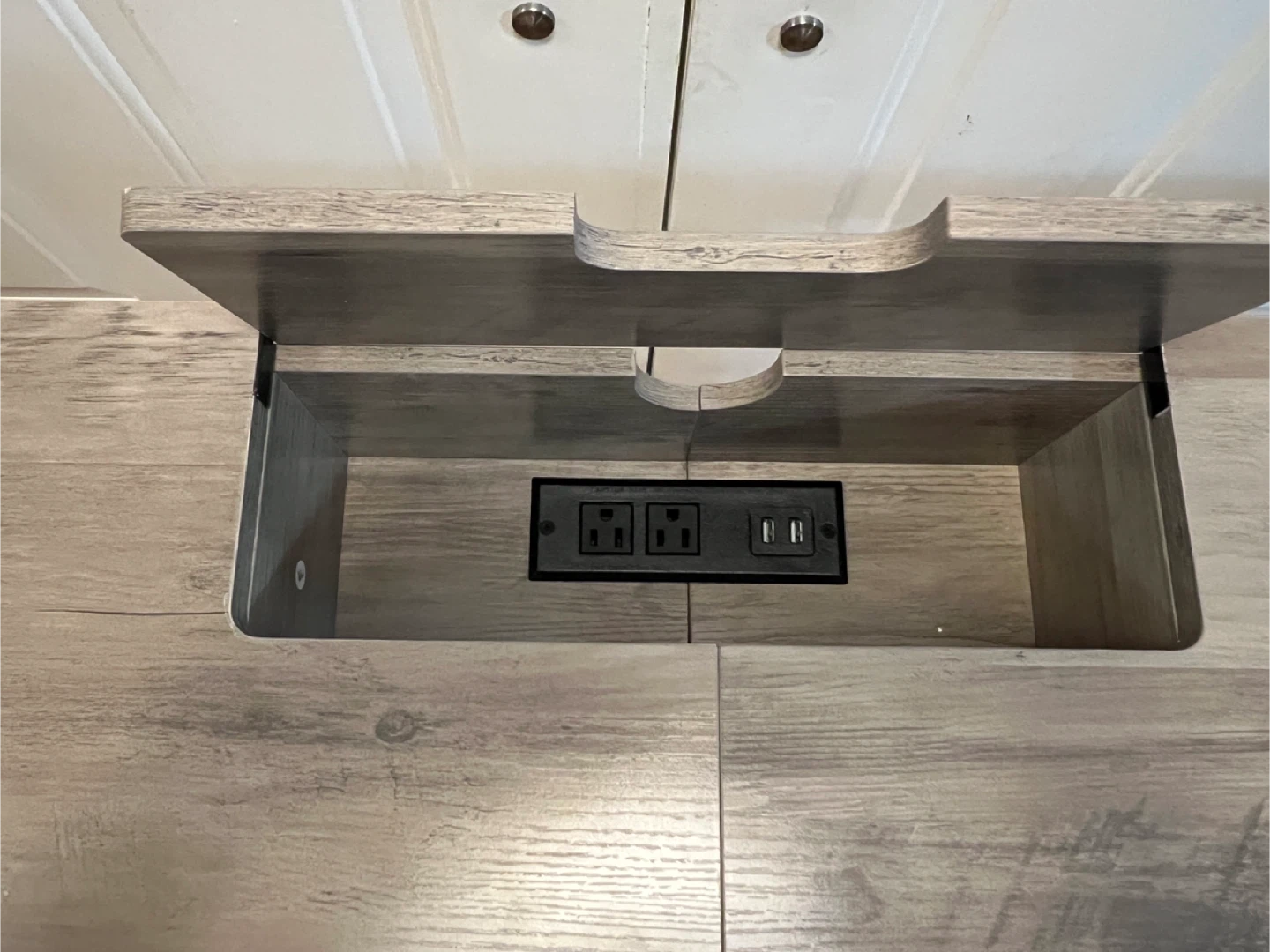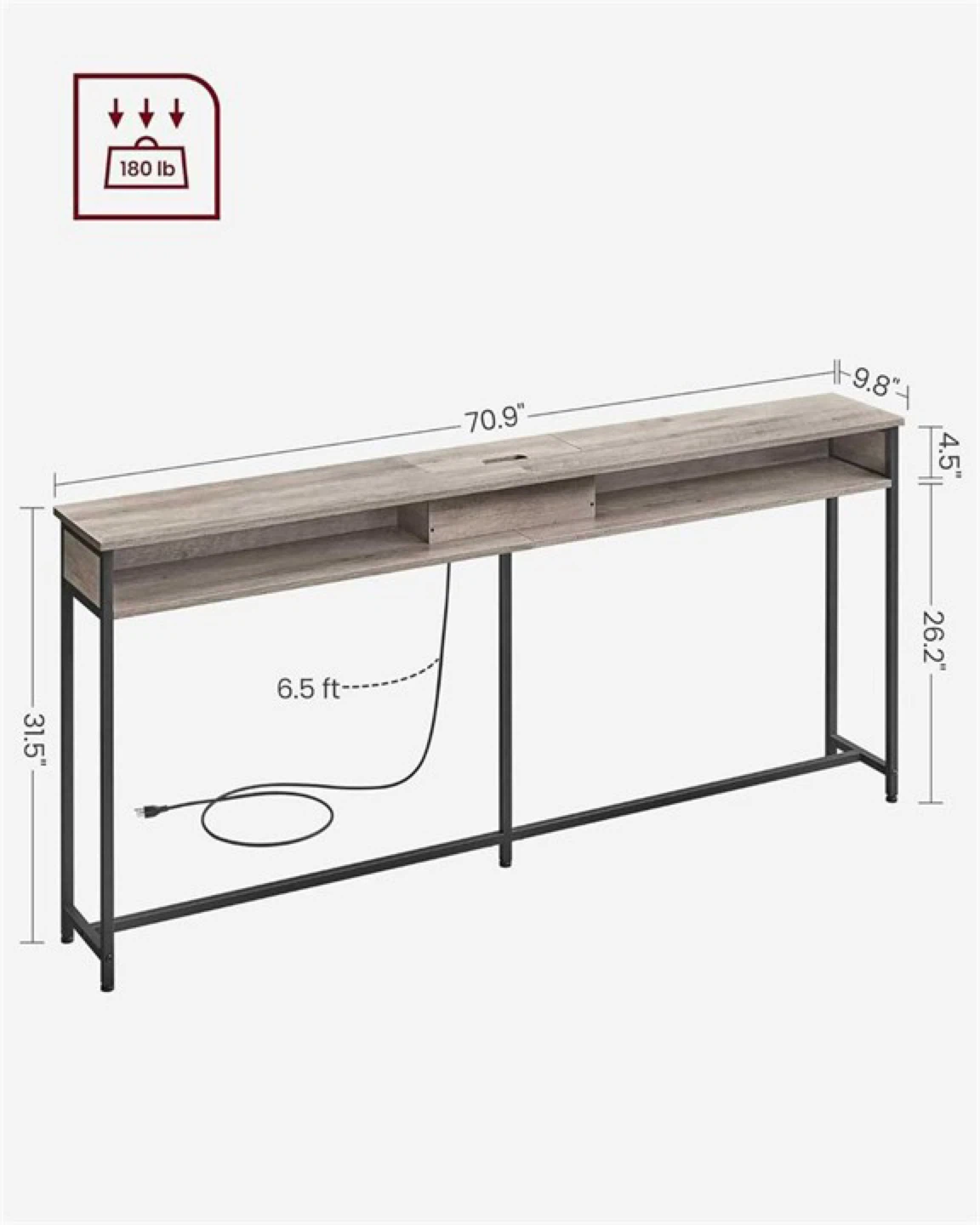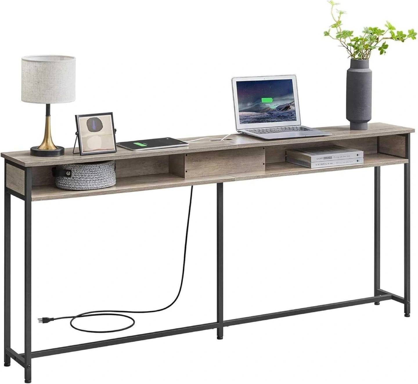 It's perfect for setting up a charging station or a small workspace. The table has a sleek design with a lift-top compartment to hide the outlets when they're not in use. Great for entryways, hallways, or behind a sofa!