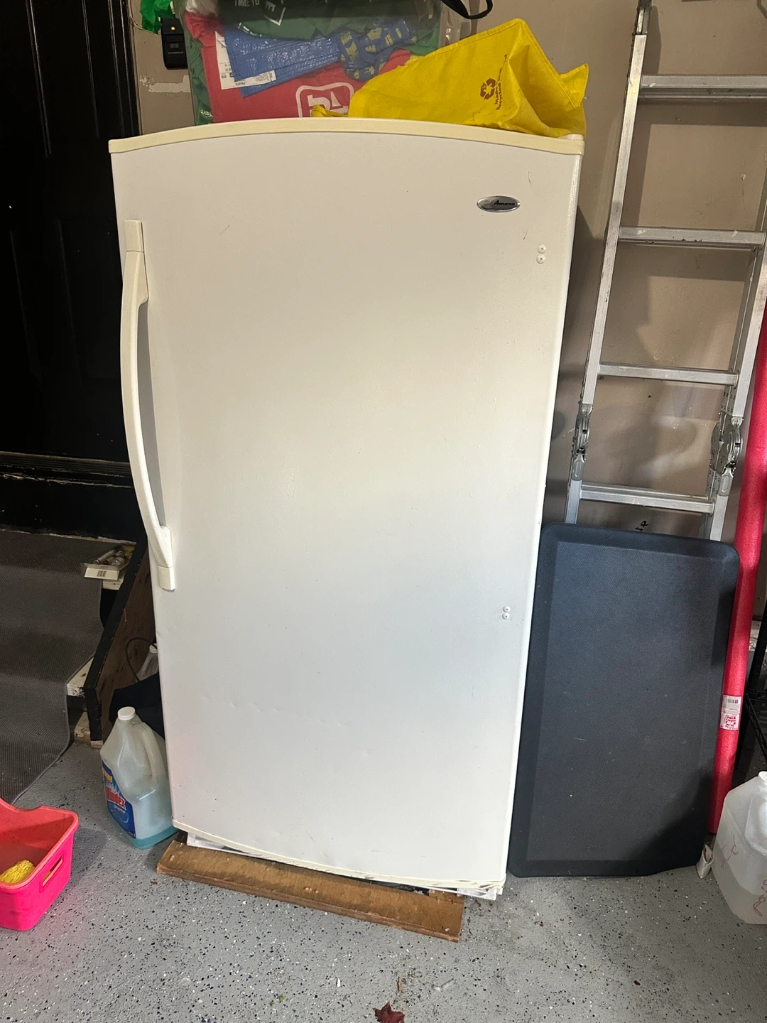 Selling an Amana upright freezer in white. It's in good working condition and ready to keep your food frozen solid! Perfect for extra storage in the garage or basement