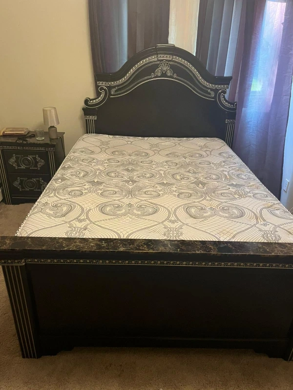Selling a bedroom set that includes a bed frame, dresser with mirror, and a nightstand. All pieces are in good condition and have a matching black finish with decorative accents. Perfect for furnishing a bedroom with a cohesive look!