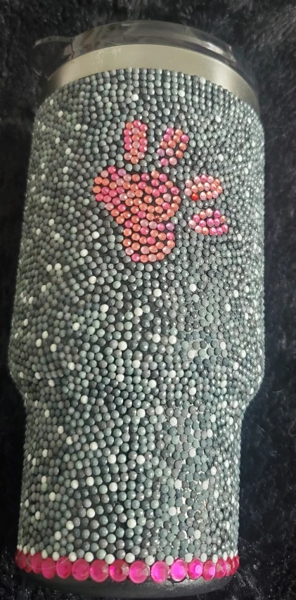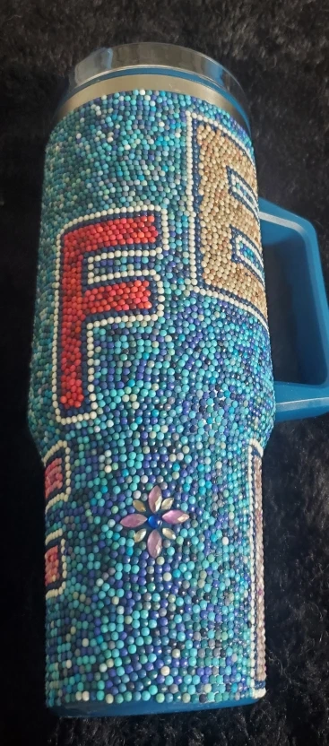 Check out this unique, custom beaded tumbler! It's got a handle and is decorated with colourful beads in different patterns and designs. A really eye-catching piece! If you have a design in mind or any logo, I can do it too
