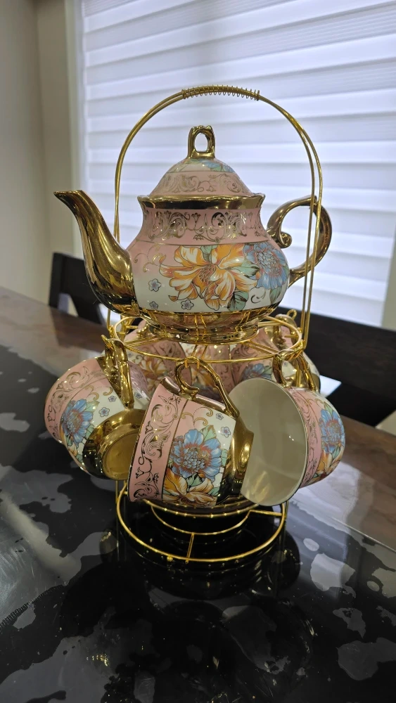 Selling a beautiful tea set featuring a delicate floral design with gold accents. It comes with a teapot, cups, and a matching gold stand for display. Perfect for afternoon tea or as a decorative piece for your home!