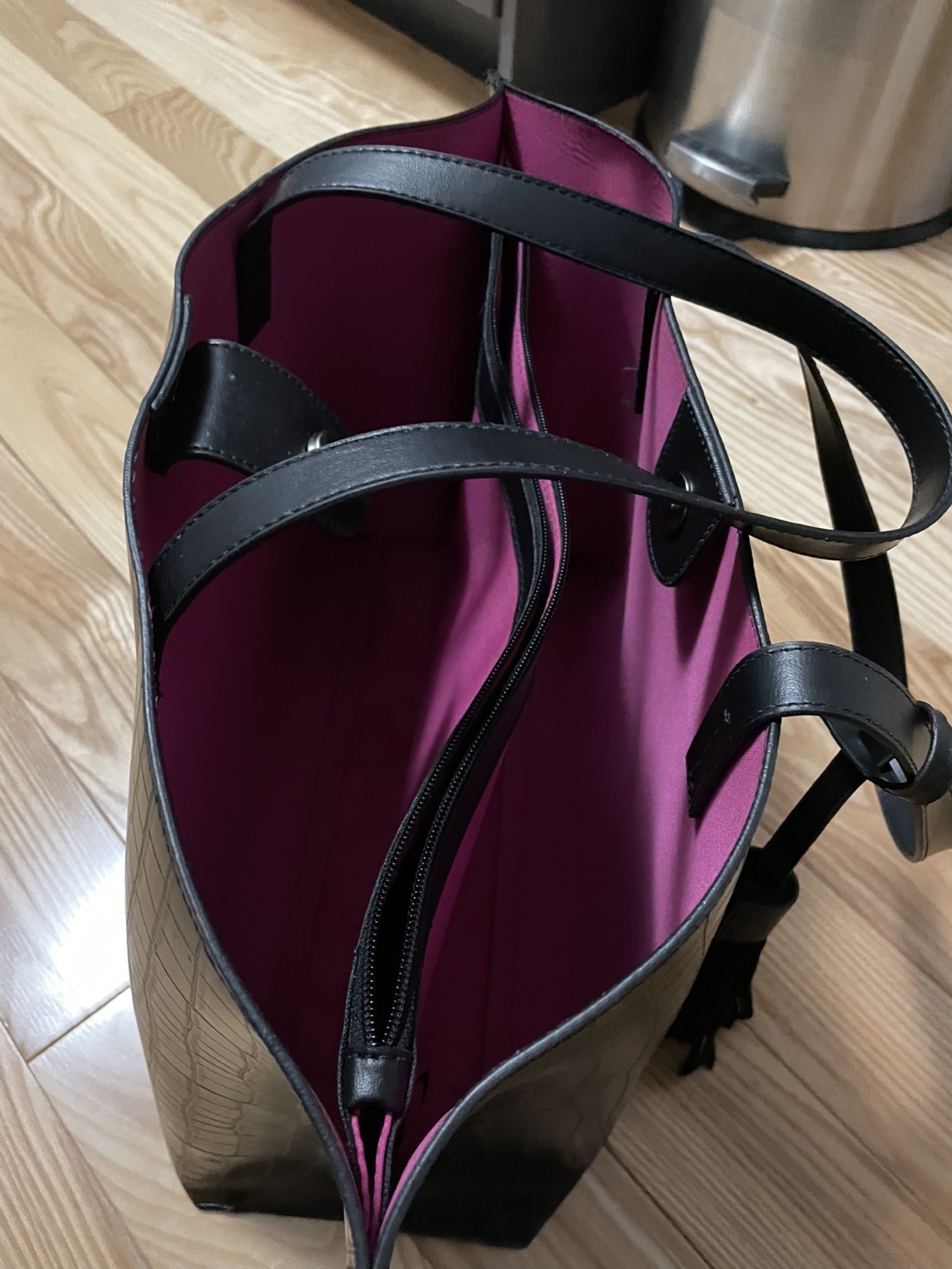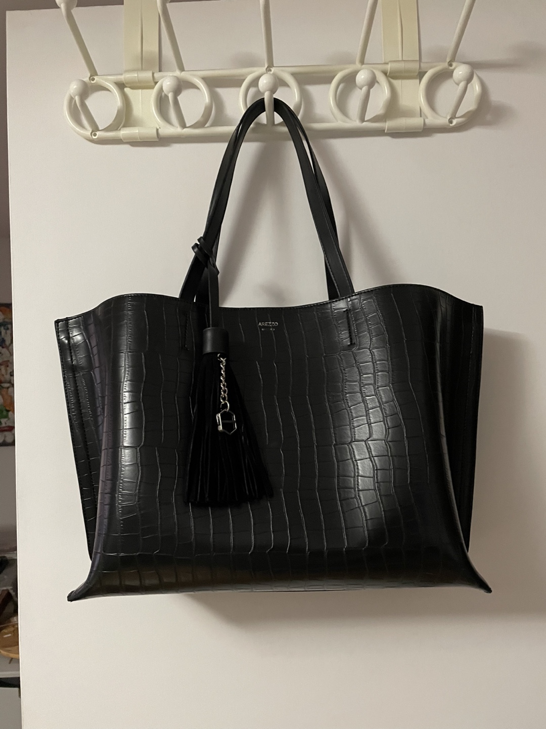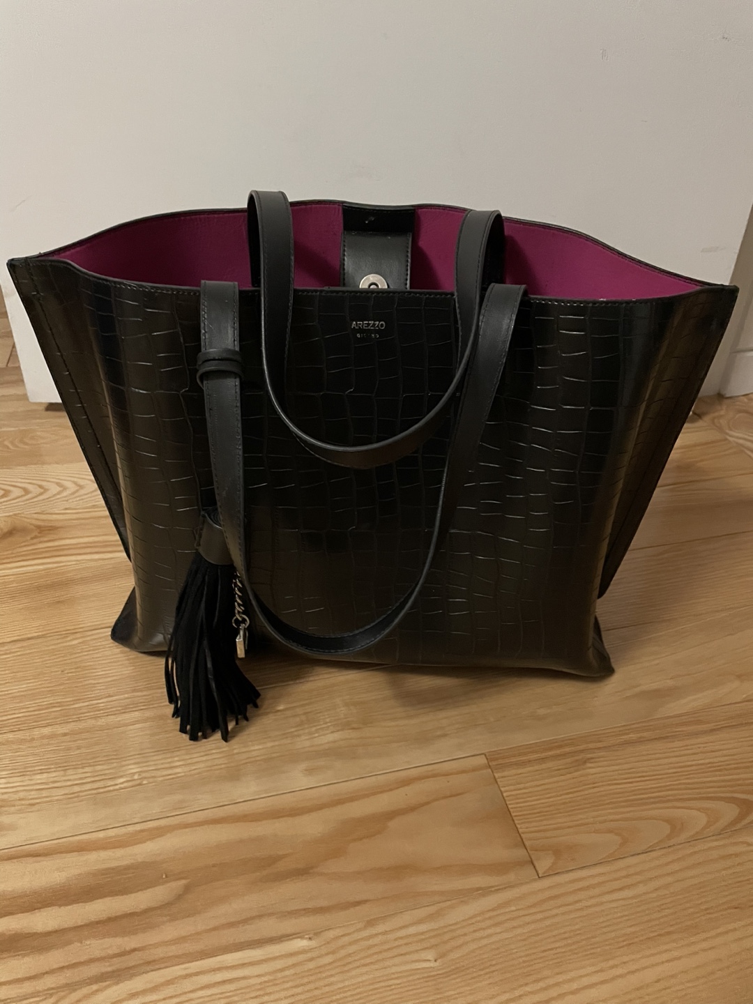 Selling a stylish Arezzo tote bag in black! It features a unique crocodile-like texture and a vibrant purple interior. Perfect for carrying your essentials in style