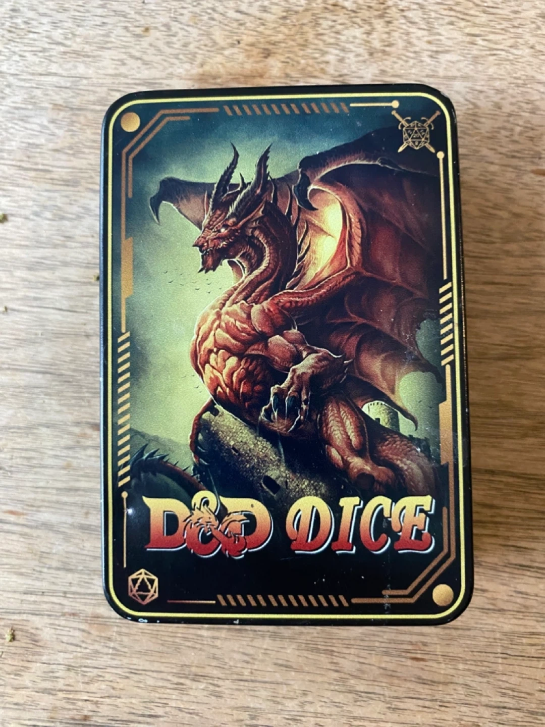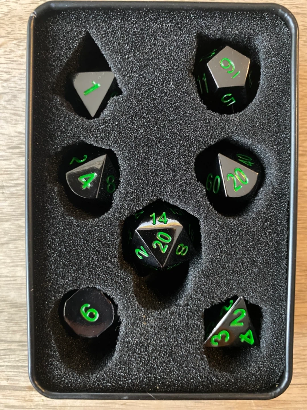 Selling a set of D&D dice and a storage tin. The dice are solid black metal with vibrant green numbers, making them easy to read during your game. Brand new and absolutely, definitely not cursed.