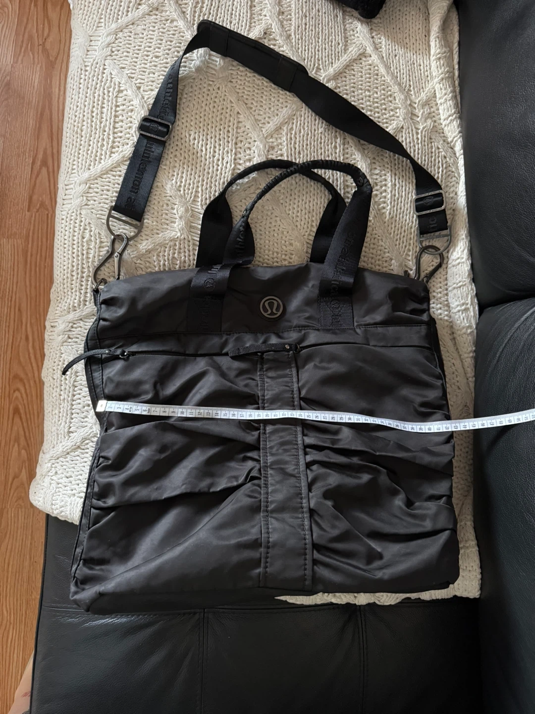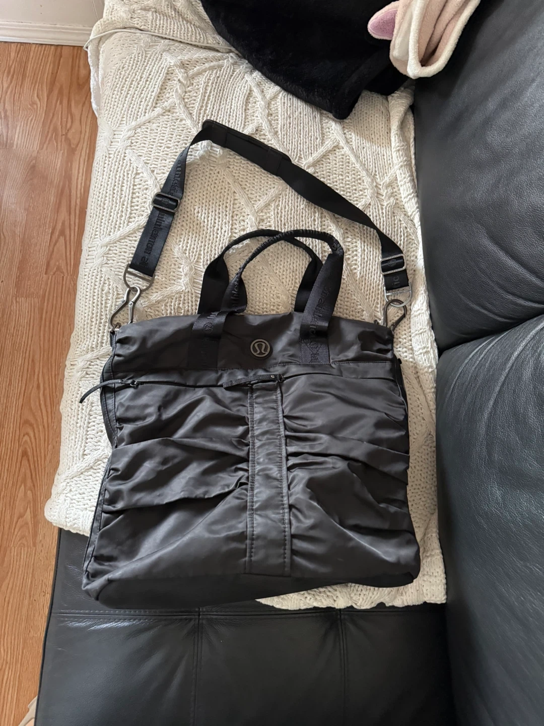 Selling a Lululemon tote bag in black. It's in great condition and ready for a new home. Perfect for carrying your essentials around town or to the gym!