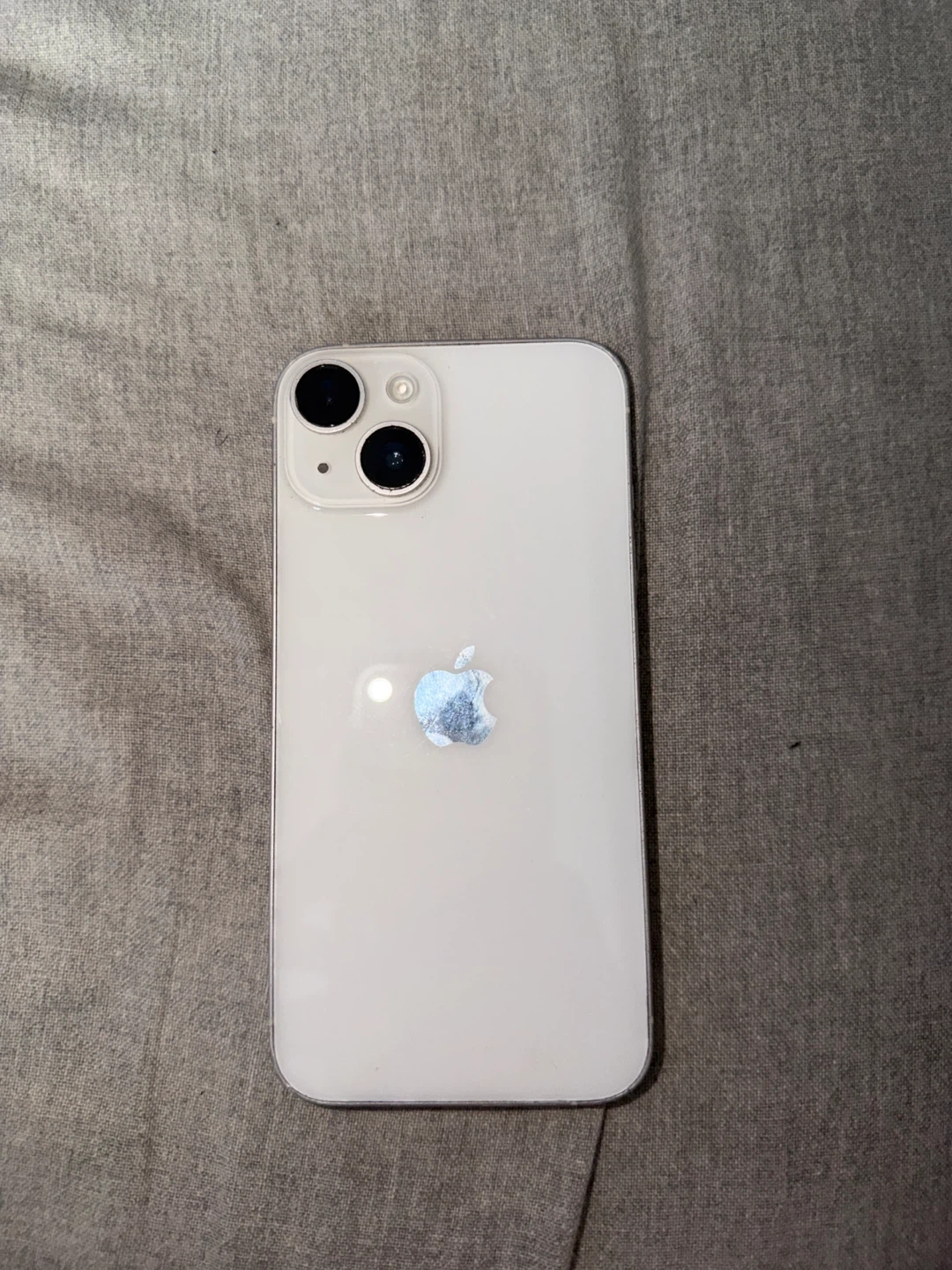 Selling a used iPhone 14 in white. There are some signs of wear and tear on the edges, but the screen is in good condition.