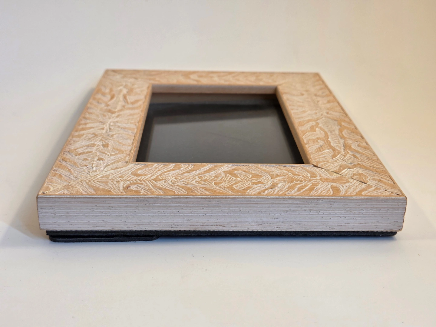 Warm, natural look photo frame with a carved leaf motif and whitewashed finish. Fits a standard 5×7 in (13×18 cm) print. Real wood face with glass front and a black easel back for tabletop display in portrait orientation. The glass is clean and clear, corners tight, and the pattern gives a cozy boho–Scandi vibe that works in bedrooms, living rooms, or entryways.