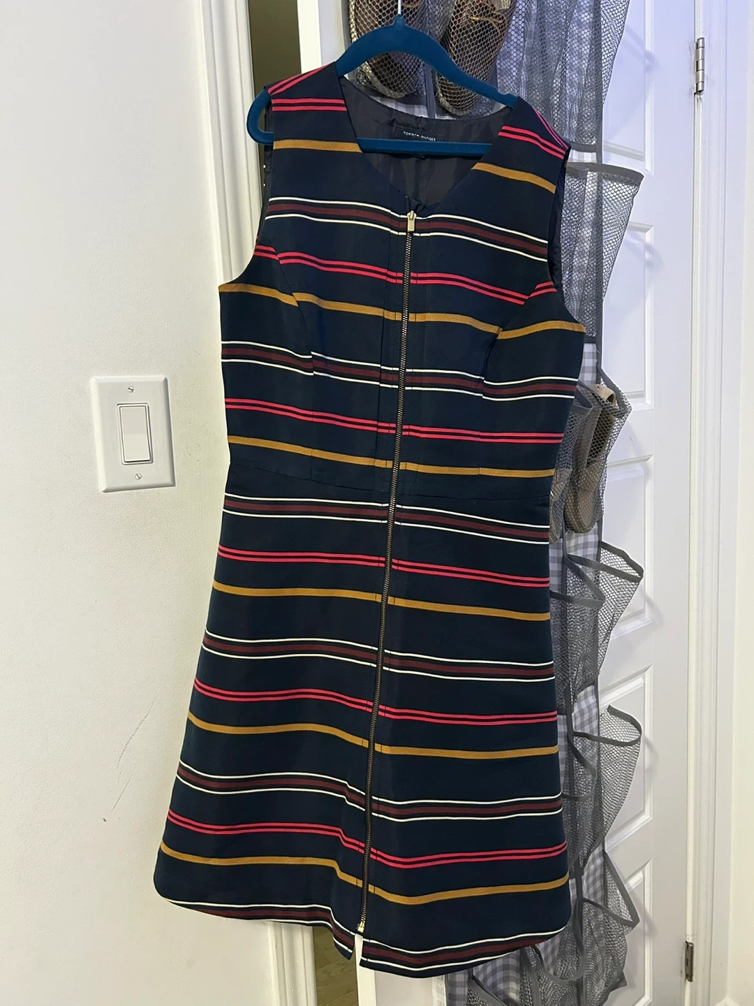 Tommy Hilfiger dress with a cute striped pattern! It's a sleeveless dress with a zipper down the front. Perfect for a casual day out or a summer event, even church service!