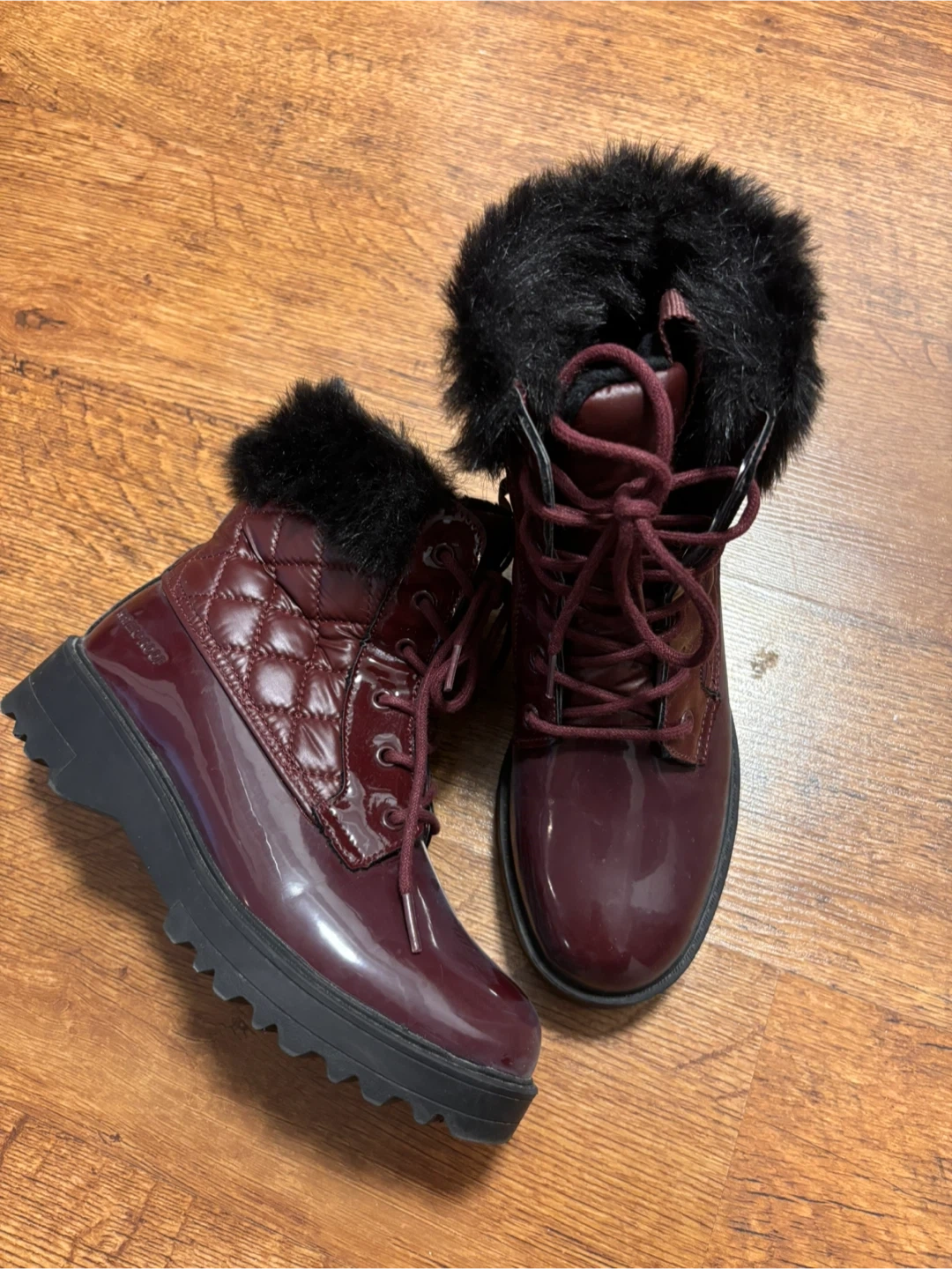 These burgundy ankle boots are super stylish! They feature a cool quilted design and a faux fur trim for extra warmth and flair.