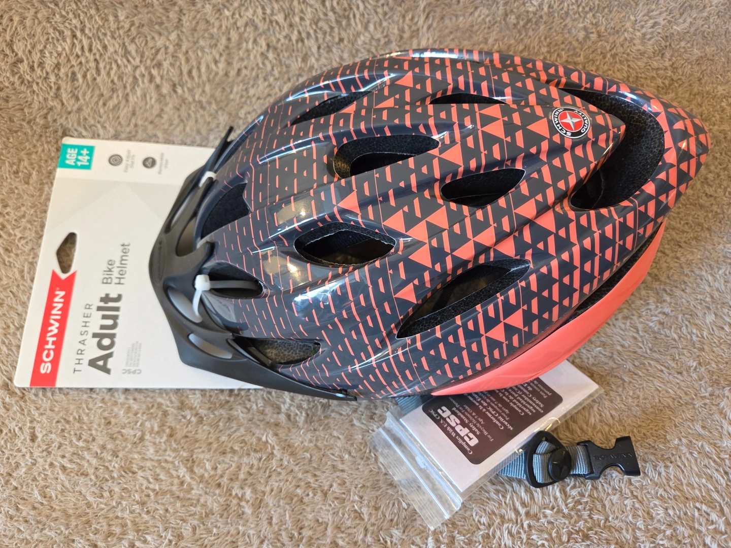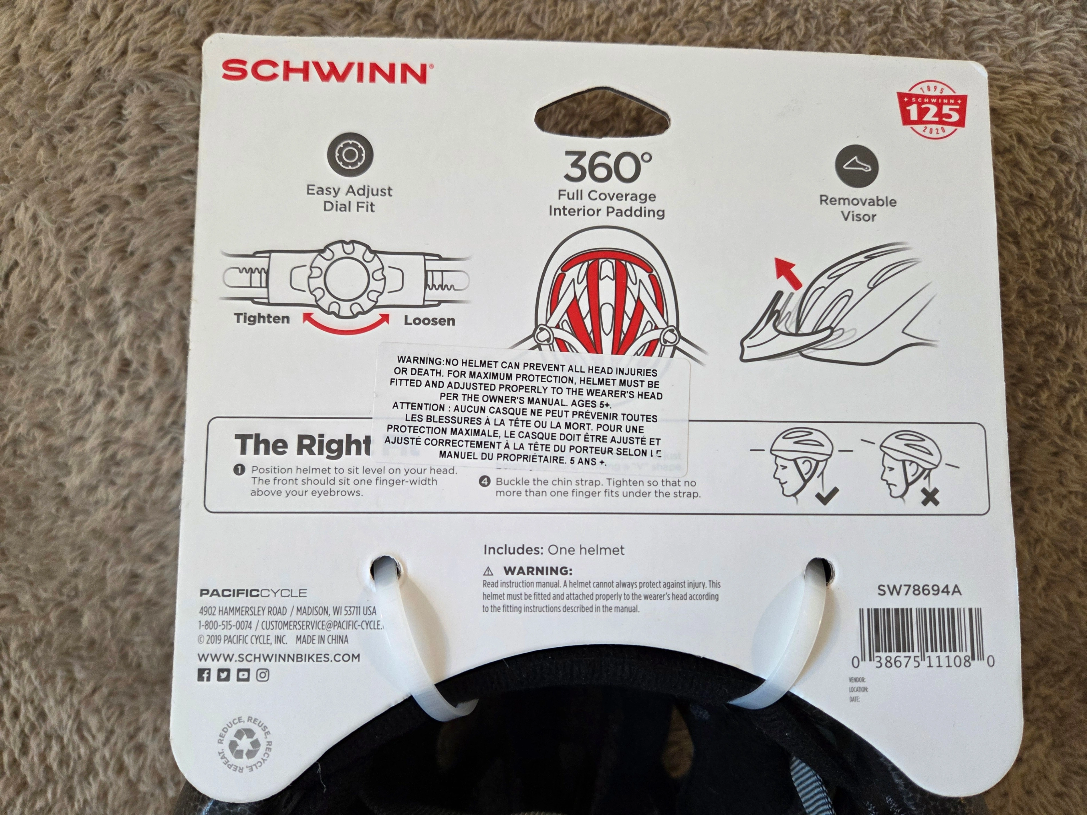 Brand new Schwinn Thrasher adult bike helmet – never used, tags attached. Universal adult fit with easy-adjust Dial Fit and 360° interior padding for all-day comfort. Includes a removable visor for sun and glare protection. CPSC compliant for riders age 14+.