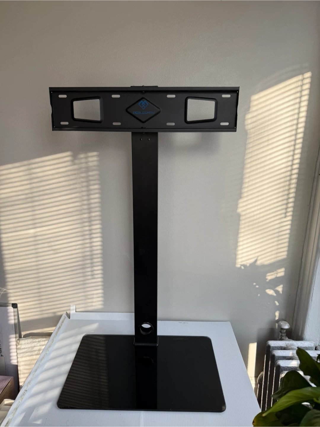 Selling a PERLESMITH floor TV stand, model PSFS01-C, designed for TVs ranging from 37 to 70 inches. It has a sleek black finish and a sturdy glass base. Perfect for those looking for a stylish and functional TV stand! The brackets for tv is not included.