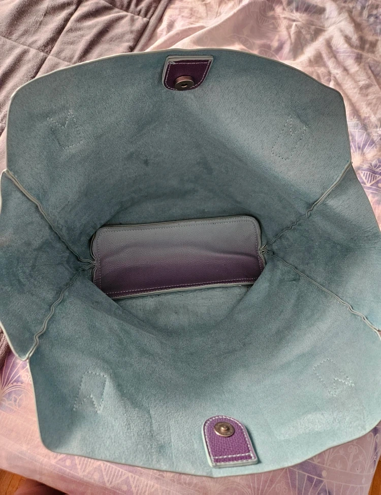 This Pixie Mood tote bag features a beautiful ombre design, transitioning from a light blue to a lovely purple. It's in great shape and ready for a new home! Perfect for carrying all your essentials in style. Large tote with snap closure.