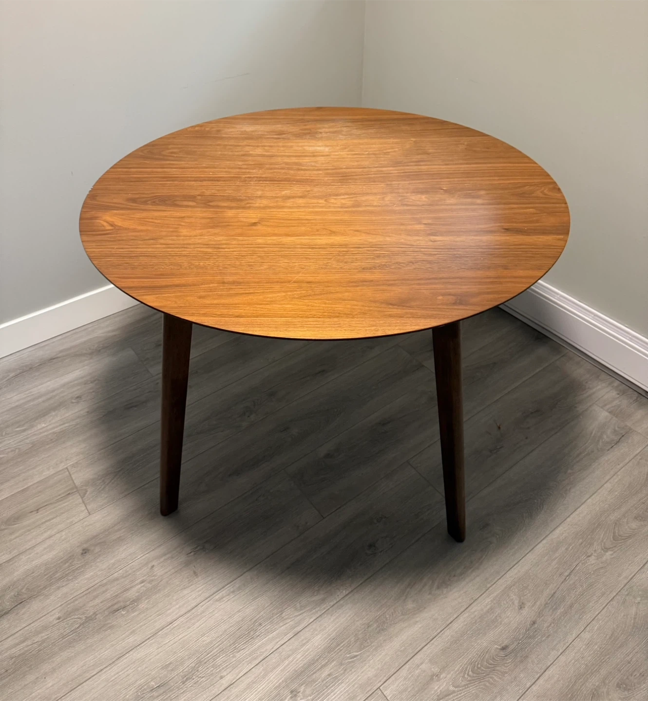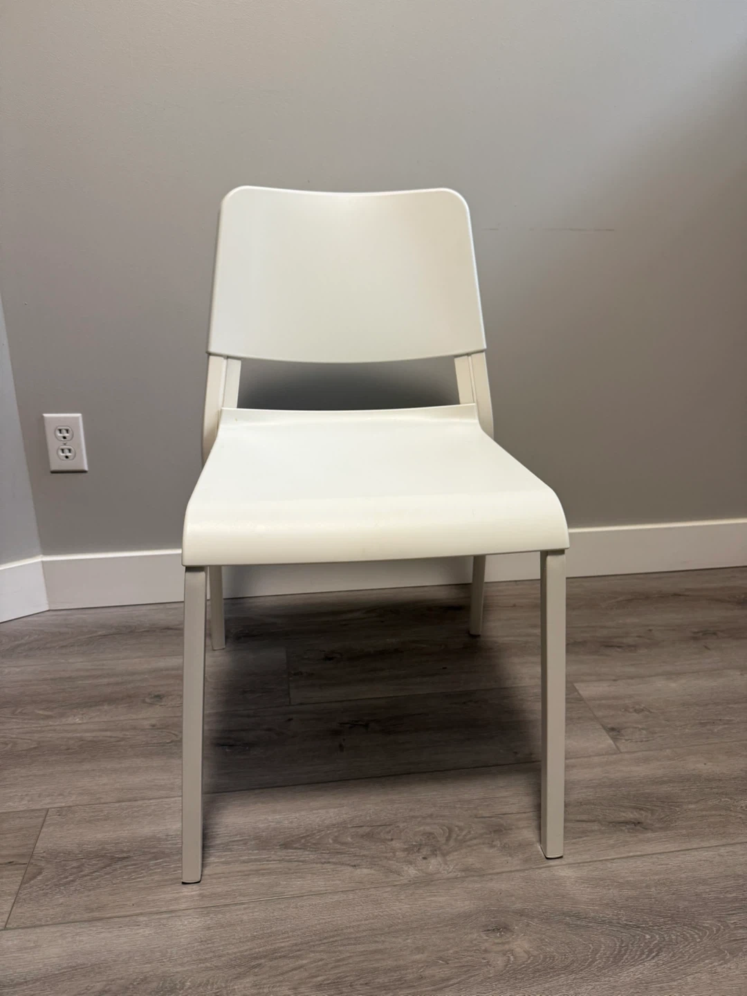 Selling a dining table and chair set. The table has a dark wood finish and a round/square top. The chairs are plastic and steel. Colour is white. Great for a small dining area or kitchen nook. Sold separately or as a set. 1 table, 4 chairs