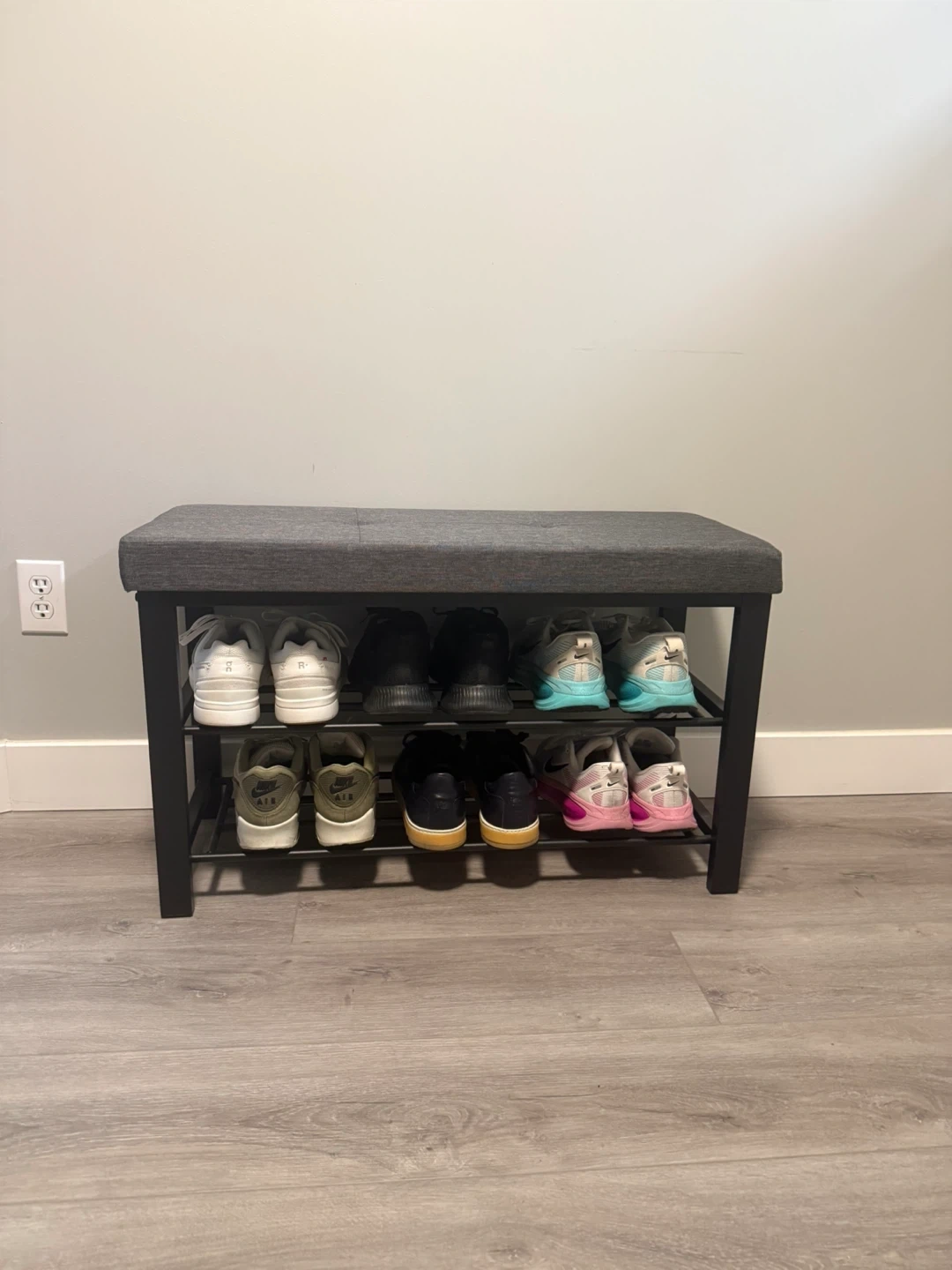 Selling a handy shoe rack bench with a comfy, upholstered grey seat. It's perfect for keeping your entryway tidy while giving you a spot to sit while putting on your shoes. Great for small spaces!