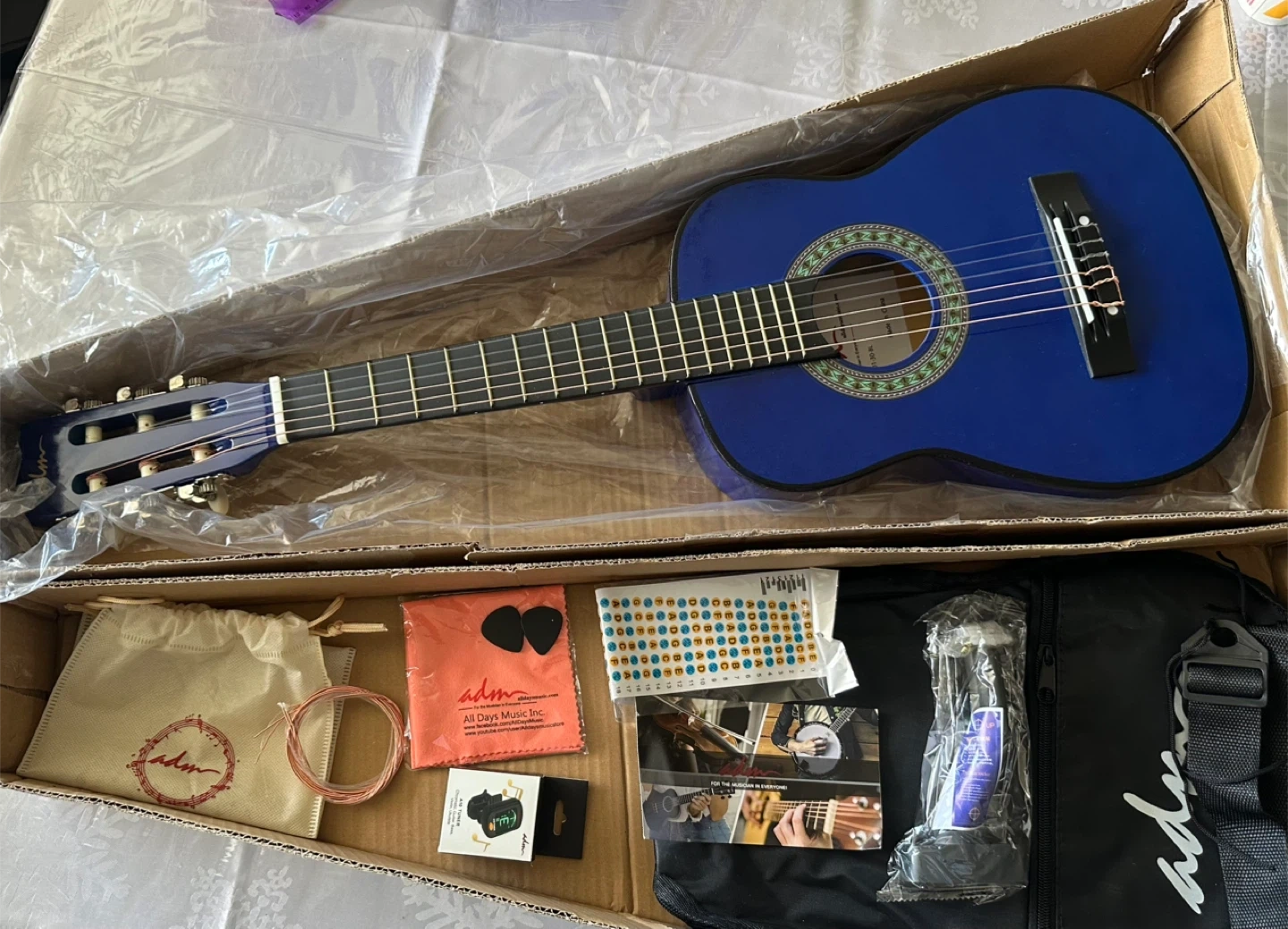 Selling a brand new ADM 30-inch acoustic classical guitar bundle! This blue nylon-stringed guitar is perfect for beginners. The bundle includes a gig bag, strap, tuner, extra strings, and picks. It also comes with the original box