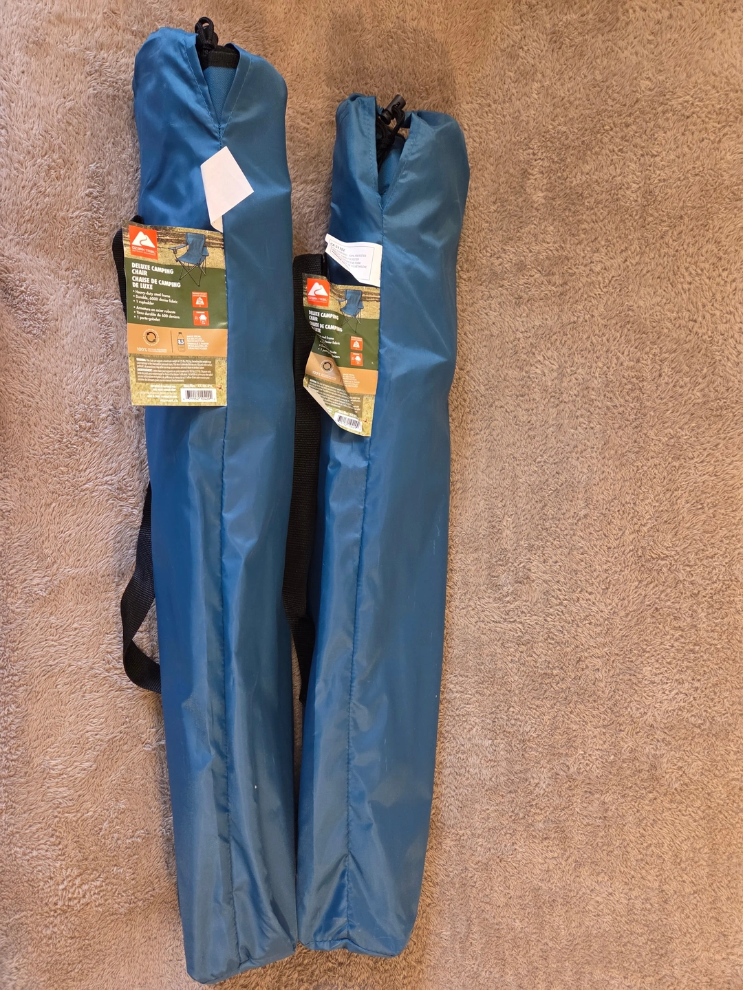 Skip the wobbly lawn chairs – these are sturdy, comfy and brand-new with tags. Selling a set of 2 Ozark Trail Deluxe Camping Chairs in Blue, each with a carry bag and shoulder strap.