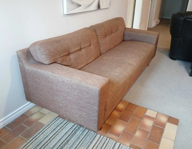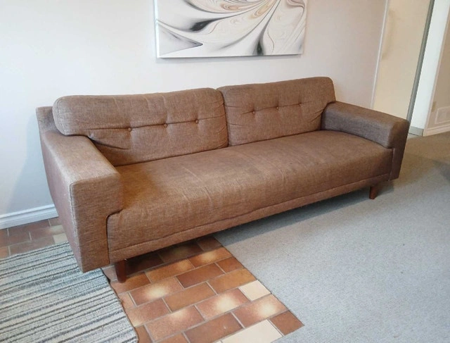 Four seater brown couch for sale. 7' long. Measures 84"x33"x31" high. Very Comfortable. Modern, clean design. Perfect for den, cottage, office or emergency bed. No major stains. No rips or odors. I replaced this with a leather set so I need this out of the living room soon. Easy pick up with no stairs to your vehicle. This can be moved by 2 people without a problem. Located between Brantford and Cambridge. Ad removed once sold.